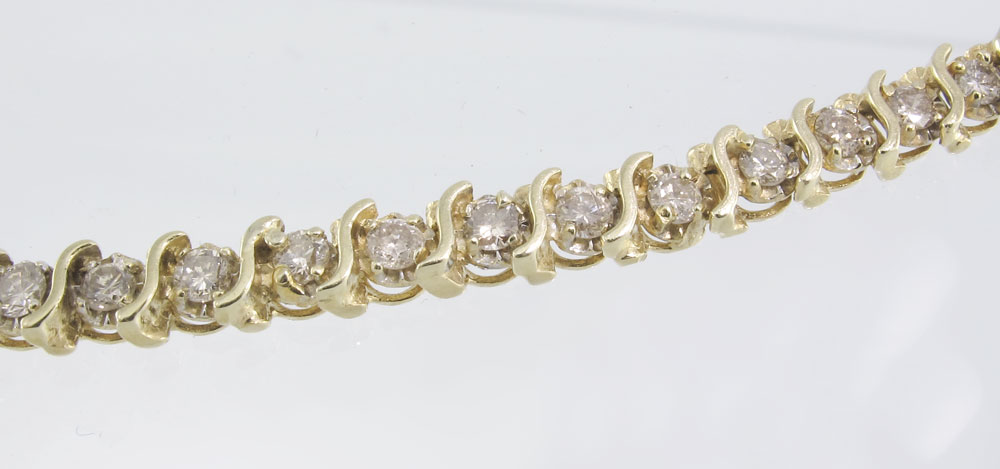 2.5 CT DIAMOND TENNIS / LINE BRACELET: 14K yellow gold bracelet contains 39 round full cut diamonds. Weight: 2.25 Ct. Approx. The diamonds average SI-I1 in clarity and Top Light Brown in color. The diamonds are prong set. Locking closure with figure eight safety clasp. Weight: 10.0 grams. Length: 6.5
