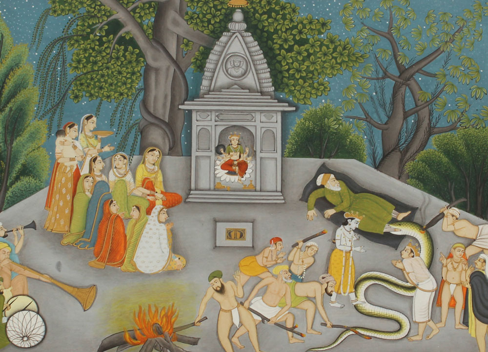 PERSIAN GOUACHE SCENE DEPICTING FIGURES BATTLING A GIANT SNAKE: Sight size 8'' x 11'', gilded frame with minor wear, 12 1/2'' x 15 1/2''.