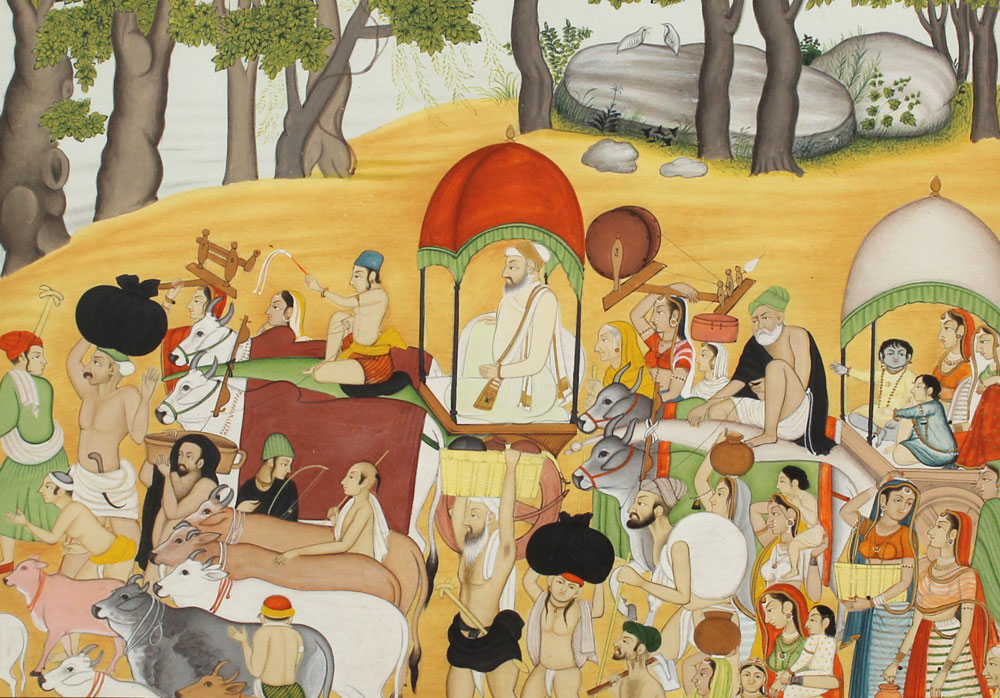 PERSIAN GOUACHE DEPICTING FIGURES TRAVELING IN A CARAVAN WITH ROYALTY, ANIMALS AND FOLLOWERS: sight size 8'' x 11'', gilded frame with wear, 13'' x 16''.