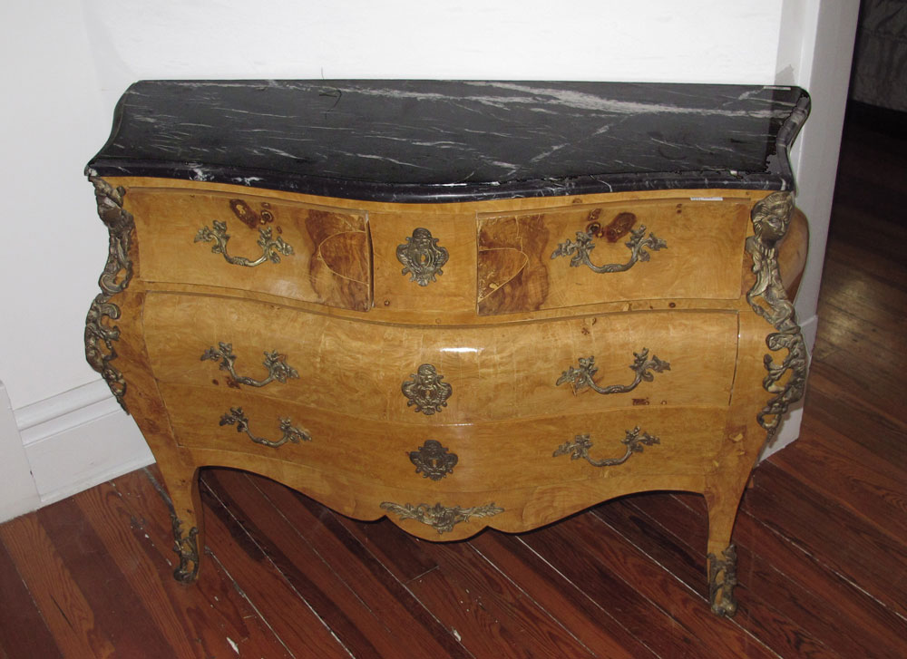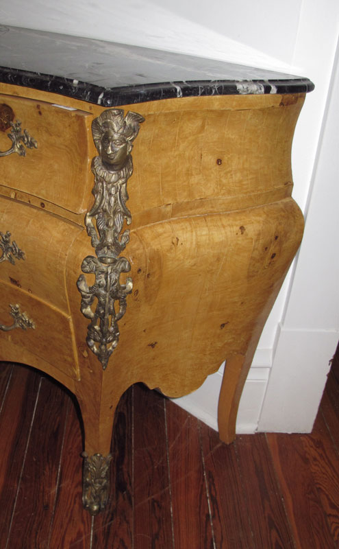 BOMBE MARBLE TOP COMMODE WITH ORMOLU MAIDENS: Variegated black marble top over two 1/3 drawers and 2 full length drawers. Cast figural maiden head ormolu decoration, ormolu pulls and escutcheons. 33 1/2'' h. x 49 1/2'' x 21''.
