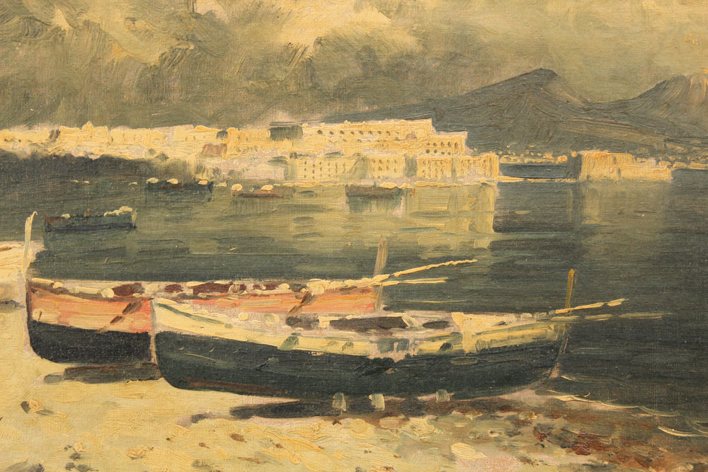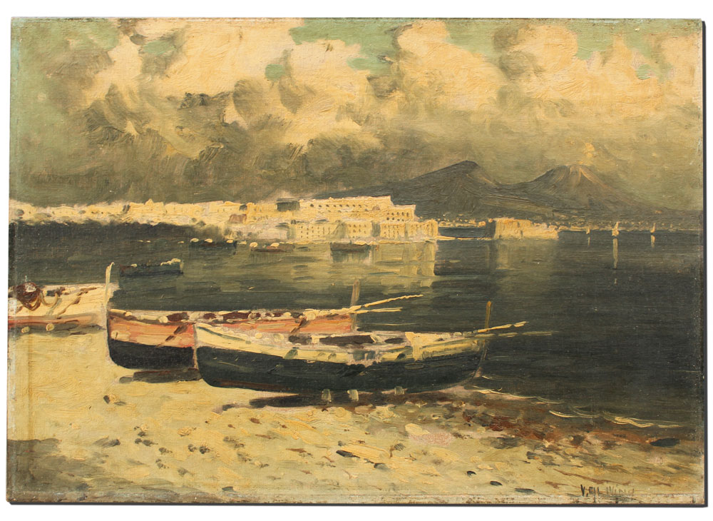 ILLEGIBLY SIGNED ITALIAN COASTAL PAINTING: Scene depicts the Bay of Naples with Vesuvius, Oil/Canvasboard, 13 1/4'' x 19'', signed lower right, framed, 16'' x 22'', circa 1950.