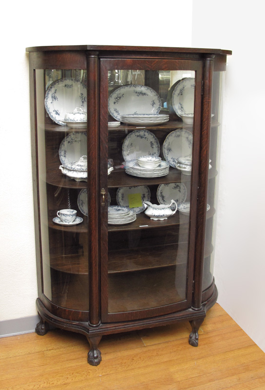 TIGER OAK TRIPLE BOWFRONT CHINA CURIO CABINET: Oak case on carved ball and claw feet. 4 wood shelves, mirror back on the top shelf. 62 1/2'' h. x 43'' x 16''.