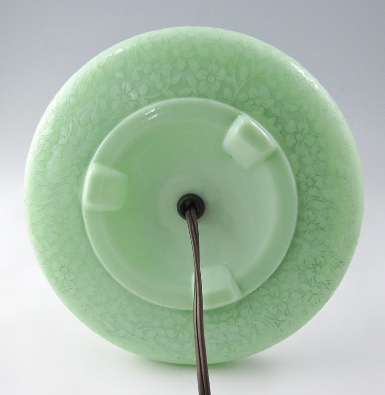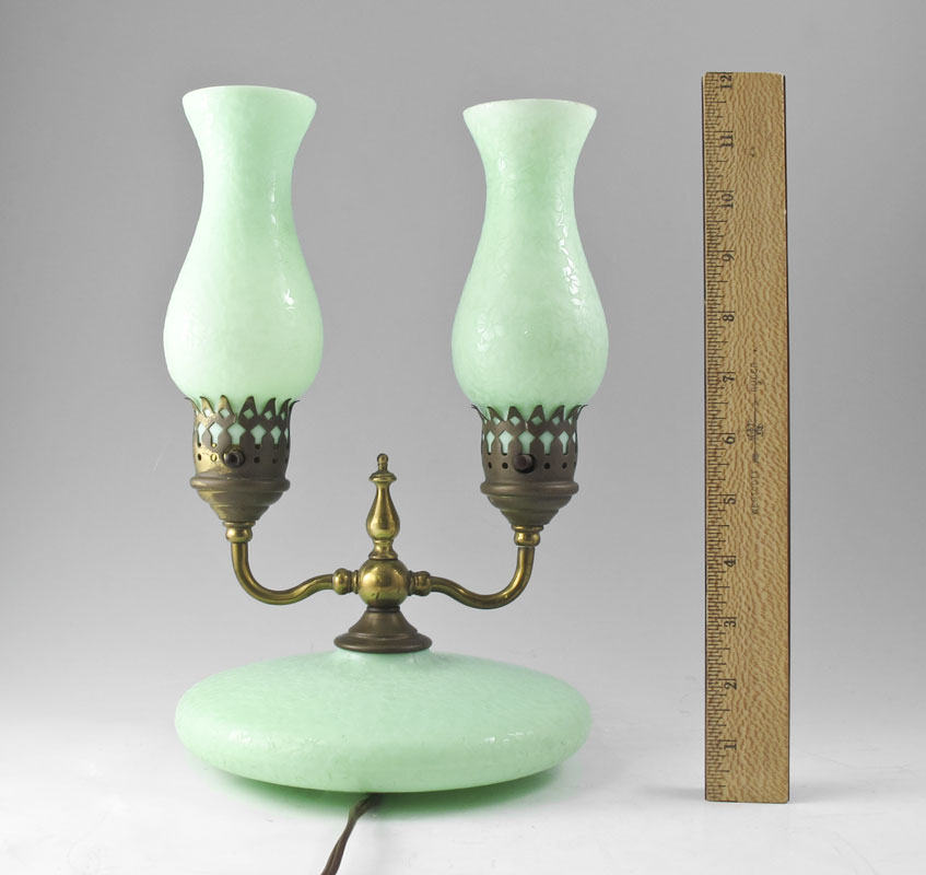 JEFFERSON JADEITE GREEN GLASS LAMP: Double shades, ''pancake'' base. 11 3/4'' h. x 7 3/8'' dia.