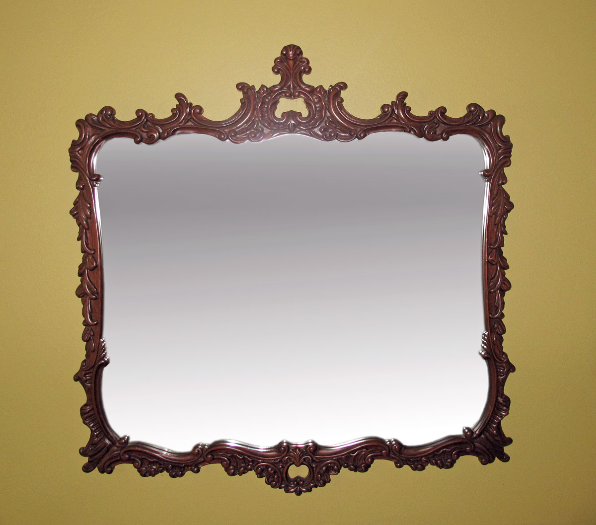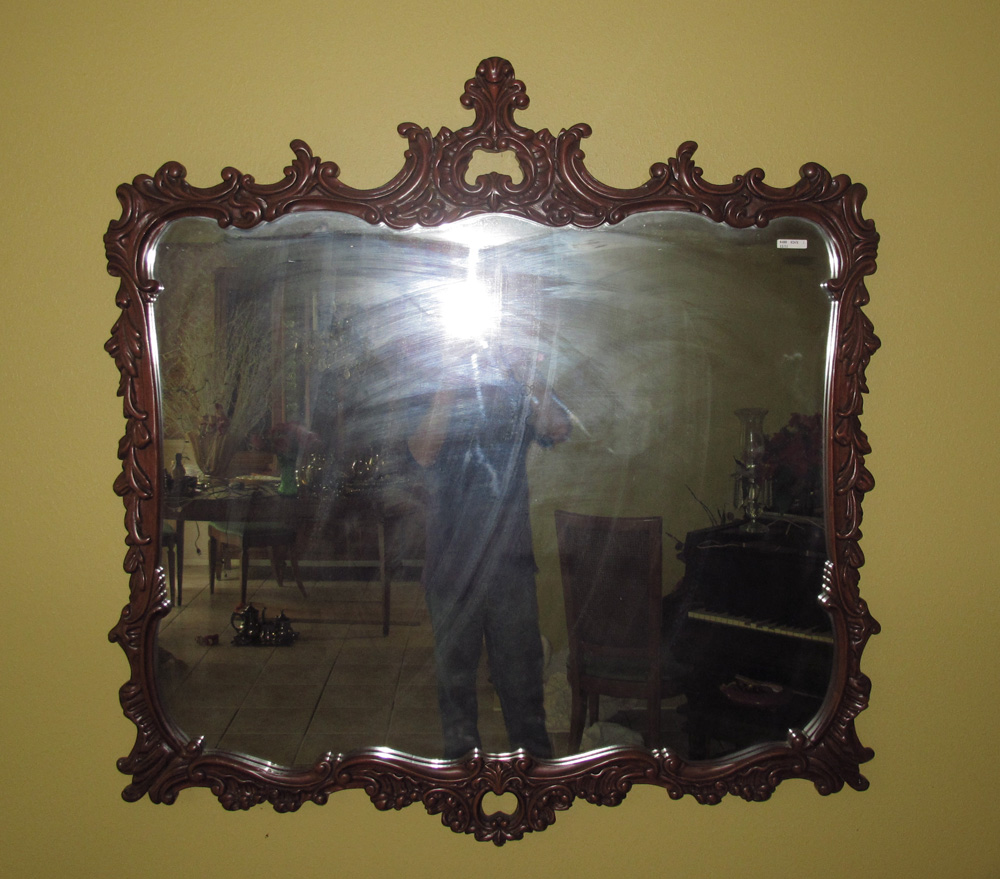 LARGE CARVED WALL MIRROR: 20th century production in carved mahogany. Approx. 46 1/2'' h. x 46''.