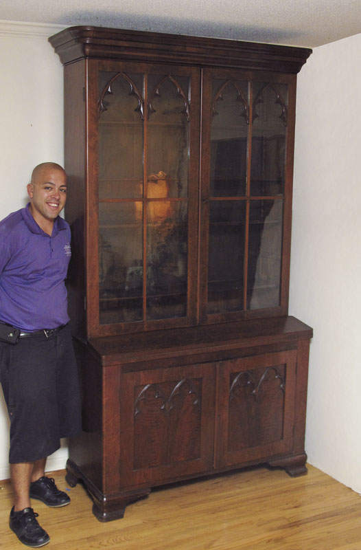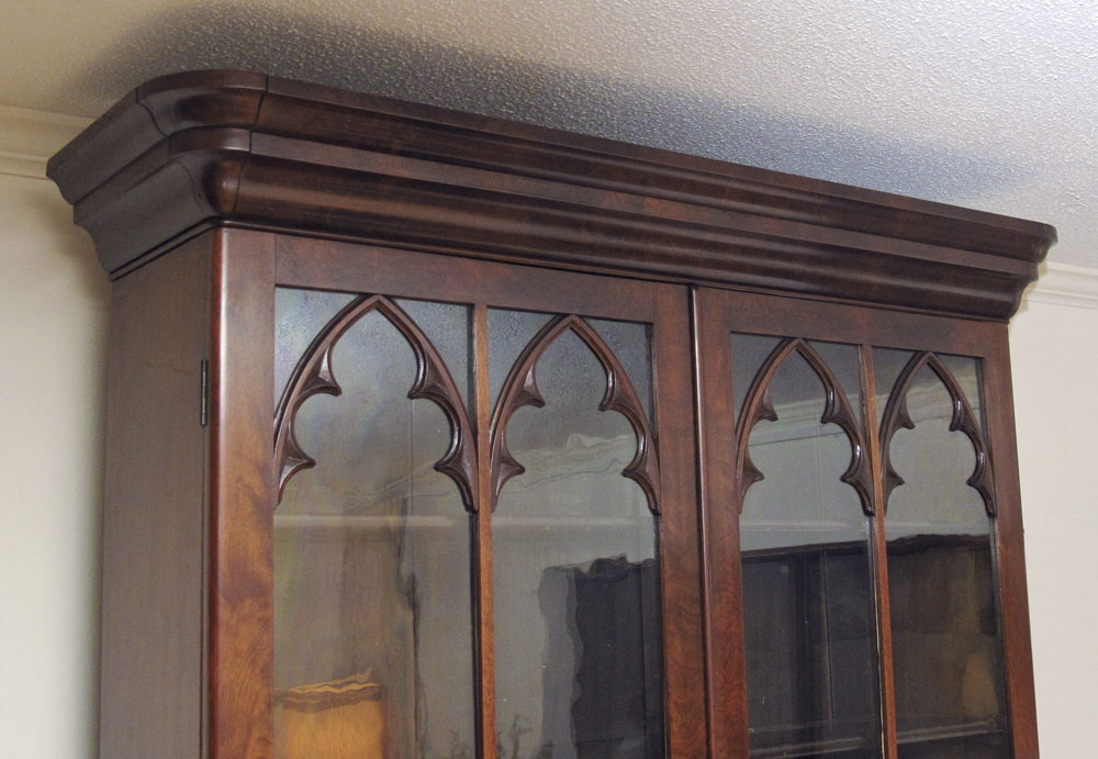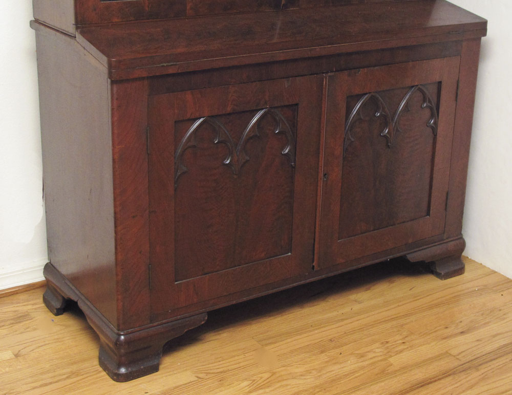 19TH CENTURY VICTORIAN STEPBACK SECRETARY BOOKCASE: Paneled glass top doors with applied architectural decoration, 4 interior wood shelves. Base section with 2 wood doors with applied matching decoration over shaped feet. 90 1/2'' h. x 49 1/2'' x 20''.