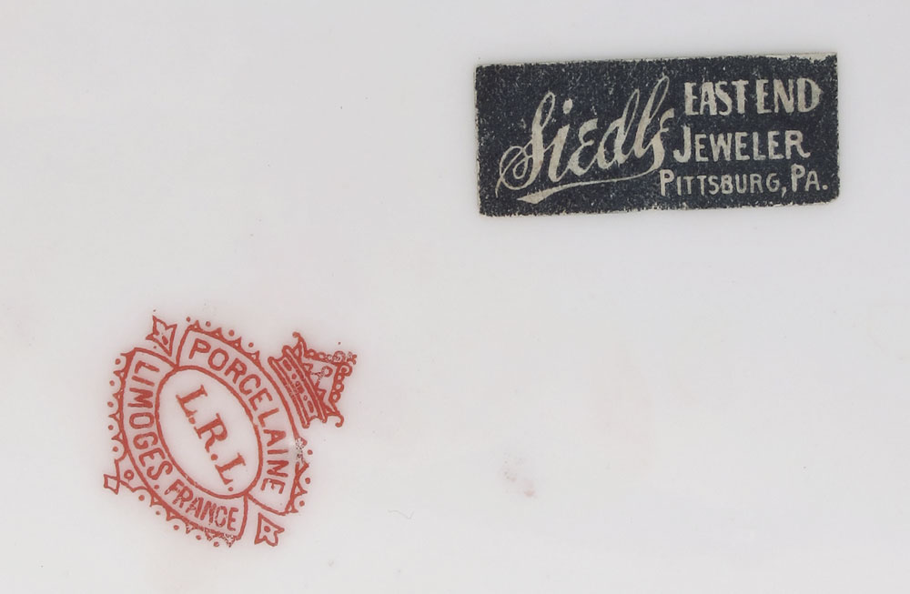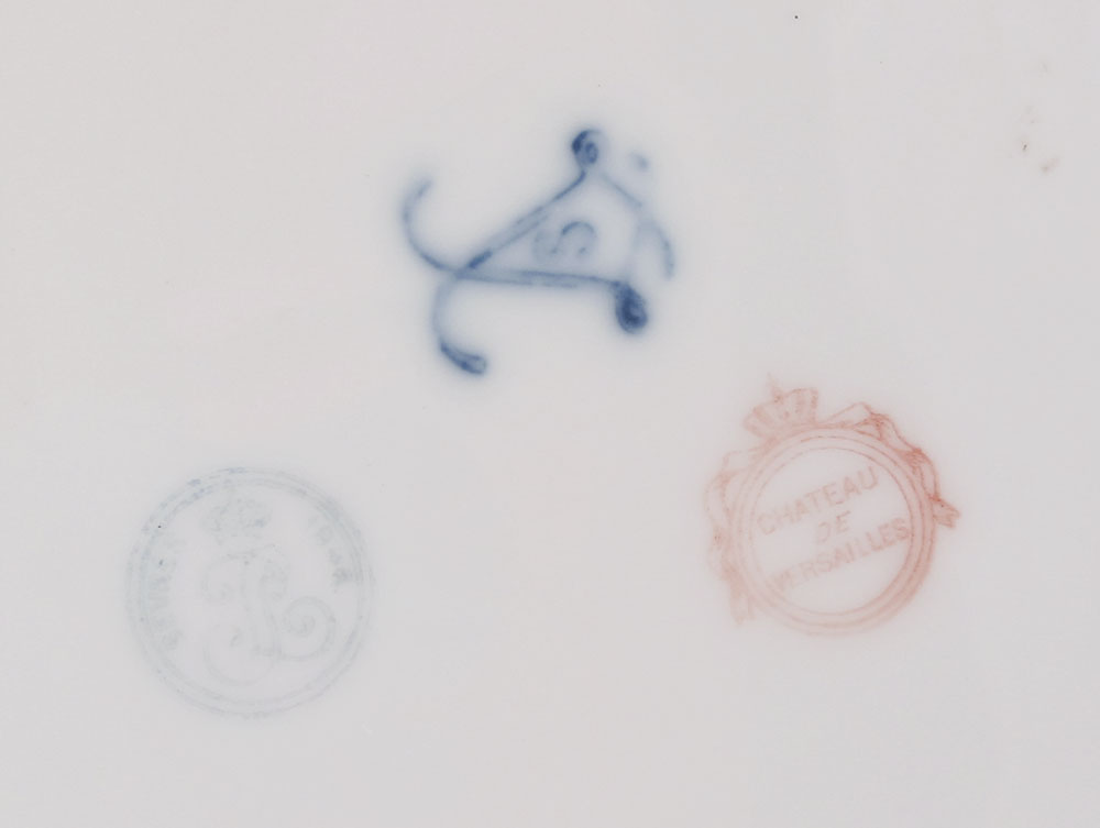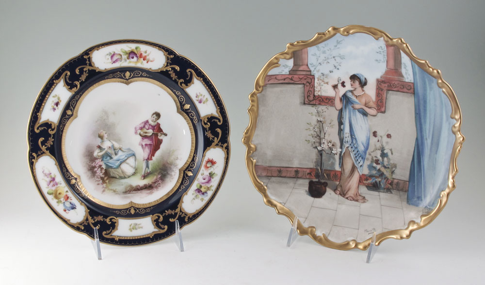 TWO FRENCH PORCELAIN CABINET PLATES, SEVRES AND LIMOGES: 1) Sevres Chateau de Versaille hand painted courting scene, cobalt border reserves of flowers, 9 1/4'' dia. 2) LRL French Limoges, image of a pensive maiden, 10'' dia.