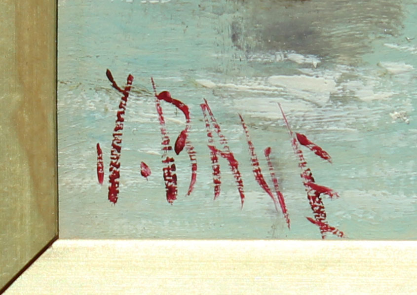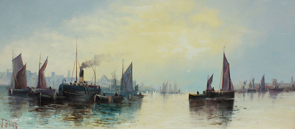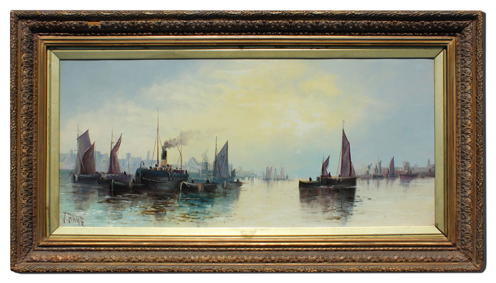 LATE 19TH/EARLY 20TH C. HARBOR SCENE: Oil/Board, illegibly signed lower left, 14 1/2'' x 32 1/2'', encased in period gesso frame with wear, 29 1/2'' x 39''.