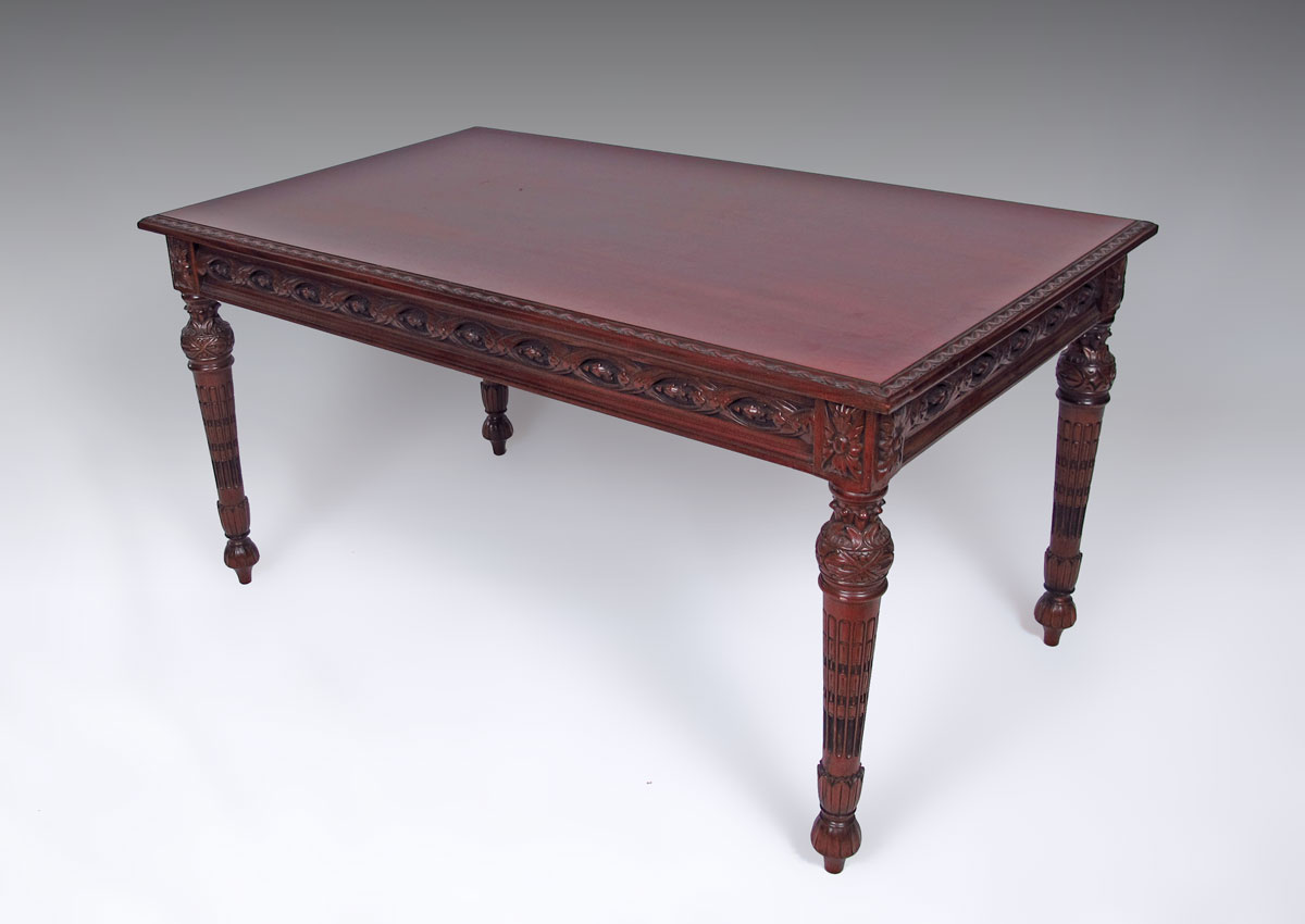 CARVED MAHOGANY COFFEE TABLE: Carved rim, apron and legs, 20''h. x 39'' x 23 1/2''.