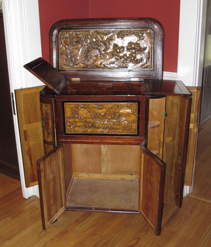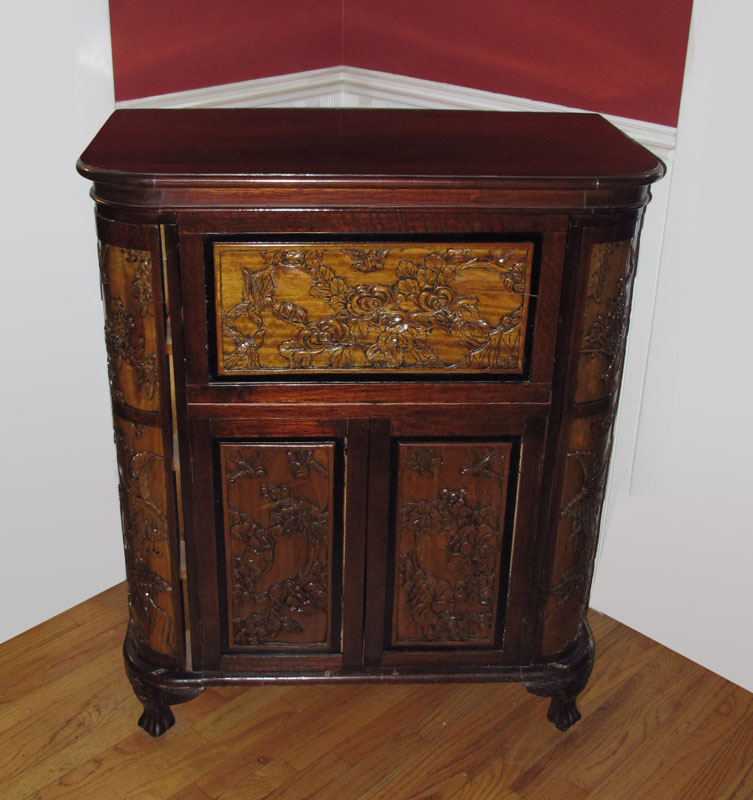 CHINESE CARVED BAR: Lift top with carved panels of birds and floral motifs on each of the 7 doors and interior of lift top. On paw feet. 42 1/4'' h. x 35'' x 18 1/2''. CONDITION: Note scratches all over, especially heavy scratches and gouges at base.