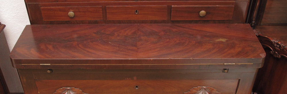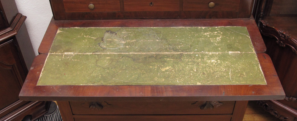 CONDITION: Veneer loss and worn leather surface.
