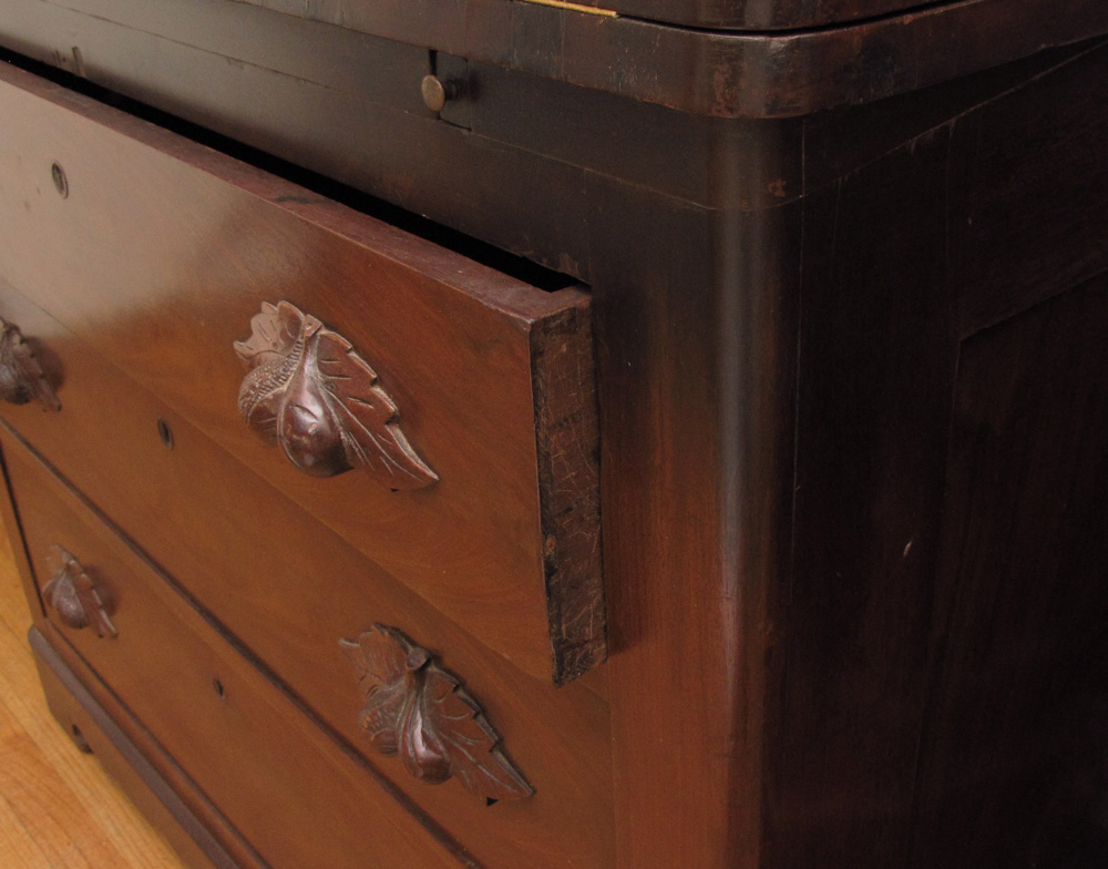 19th C STEPBACK SECRETARY BOOKCASE: Two part cabinet with upper section having glass front doors. The lower section with flip open desk over drawers with fruit carved pulls. 80''h x 42'' x 21''.