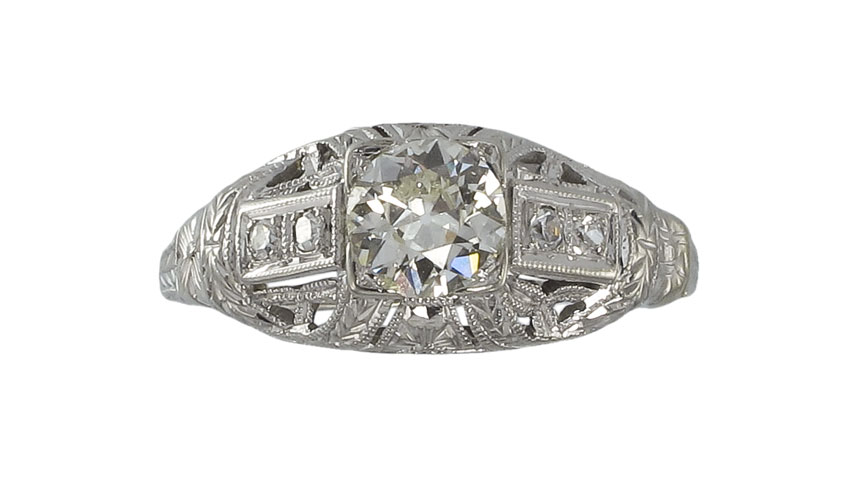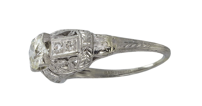 1920'S 18K GOLD DIAMOND FILIGREE RING: 18K white gold ring centers an old European round cut diamond, approx. .53 ct, rated VS1 in clarity and J in color. The 4 round single cut accent diamonds weigh approx. .06 Ct. All stones are prong set. Signed Barth. Size 6.5. Weight 2.9 grams. Sold with current Atlanta Gemological GIA graduates appraisal for $2,450.