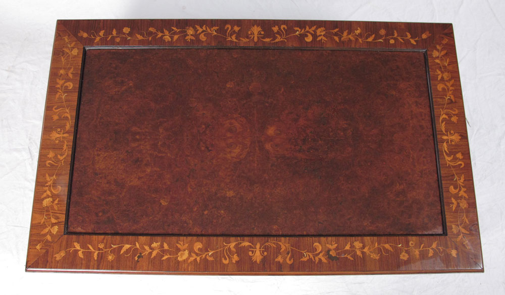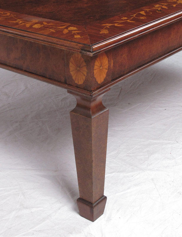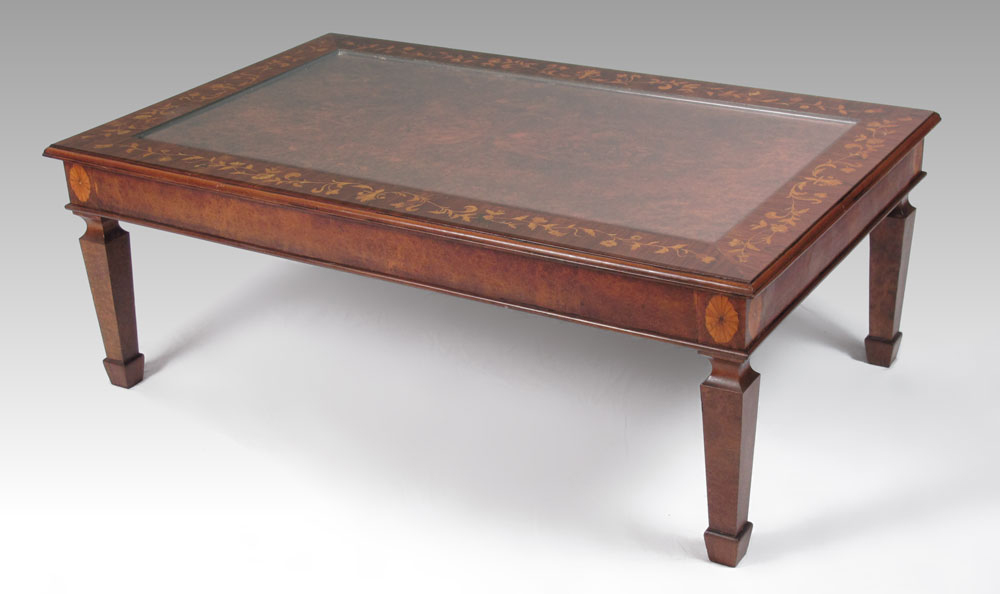 FRENCH INLAID COFFEE TABLE WITH GLASS TOP: Floral inlay rim with burl wood veneer inset interior and glass top insert. 18 1/2'' x 51 1/4'' x 31 1/2''.
