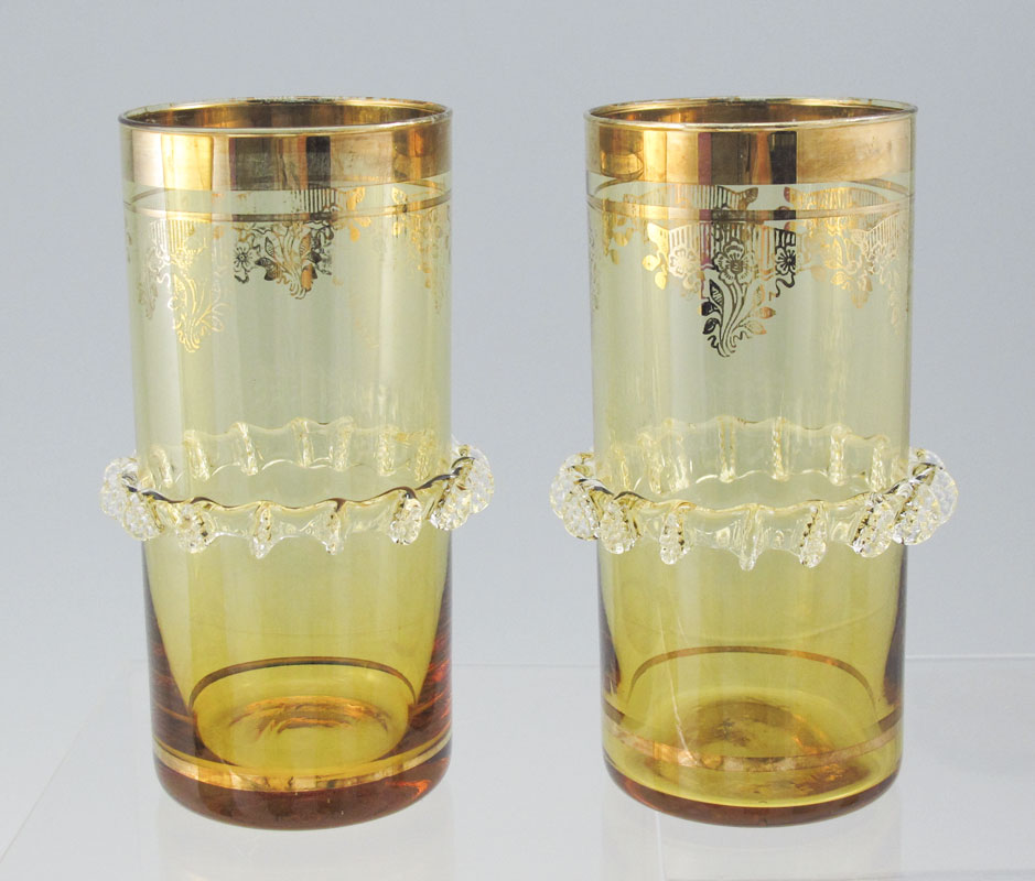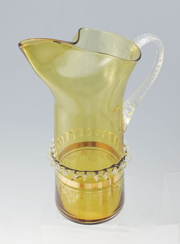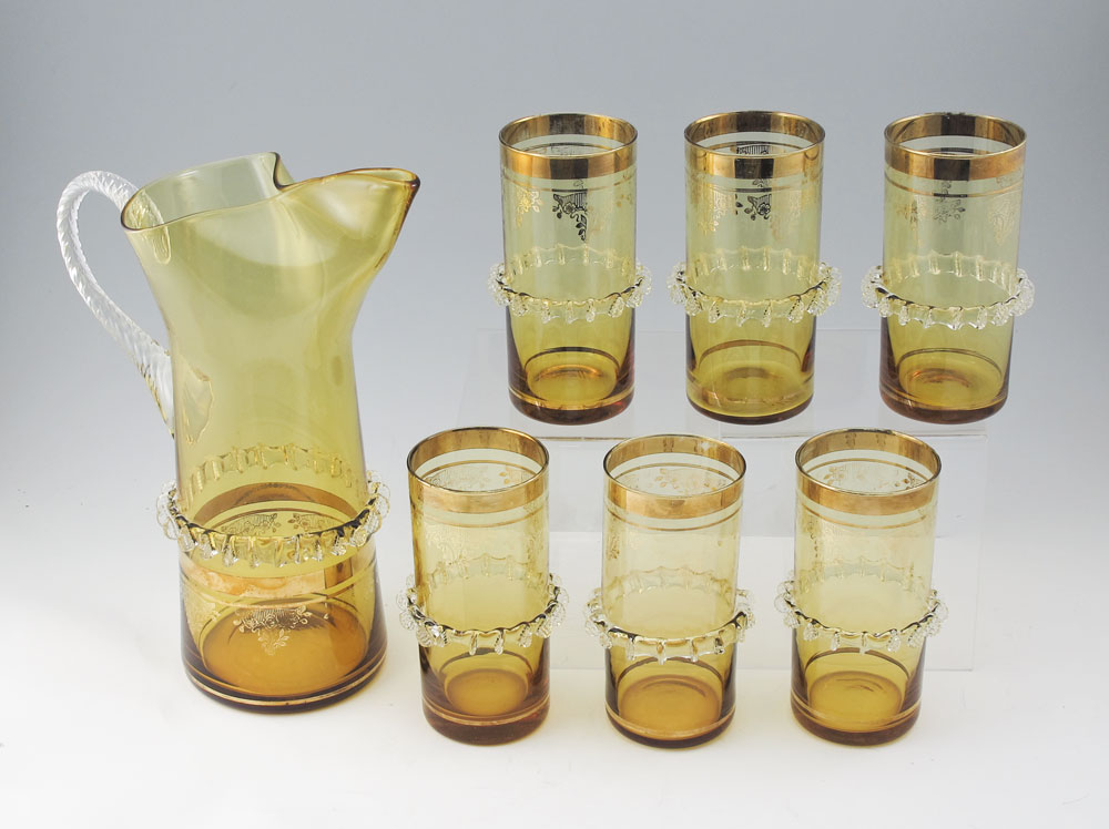 VENETIAN GLASS PITCHER AND TUMBLERS: Rigaree and gilt decorated amber blown glass pitcher, 11'' tall, with 6 tumblers, 5 1/2''.