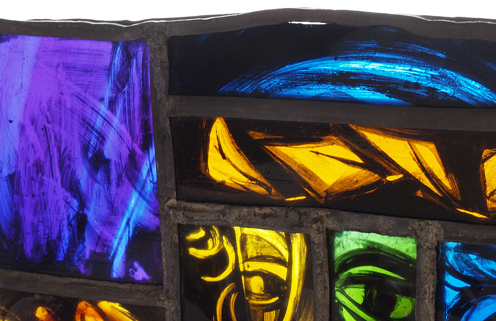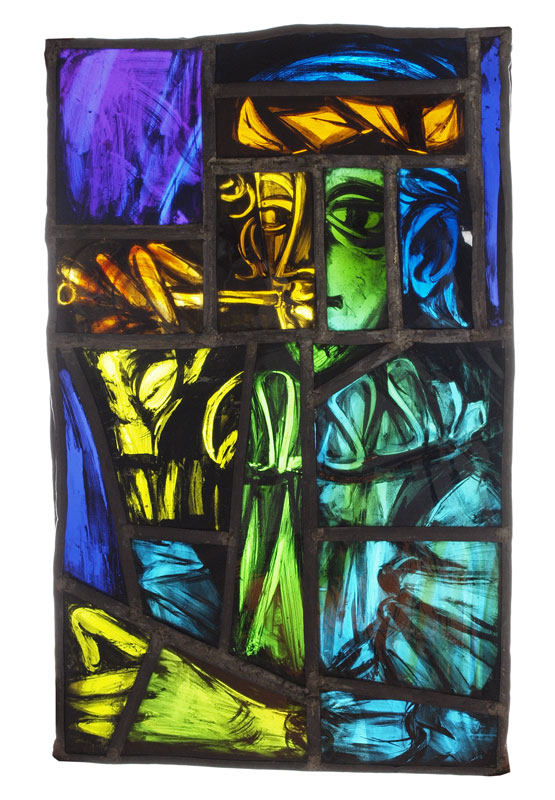 EARLY HAND PAINTED STAINED GLASS PANEL: Painted image depicting Sir Walter Raleigh. Random color and size pieces, leaded and hand painted. Measures approx. 25 1/2'' x 16''.