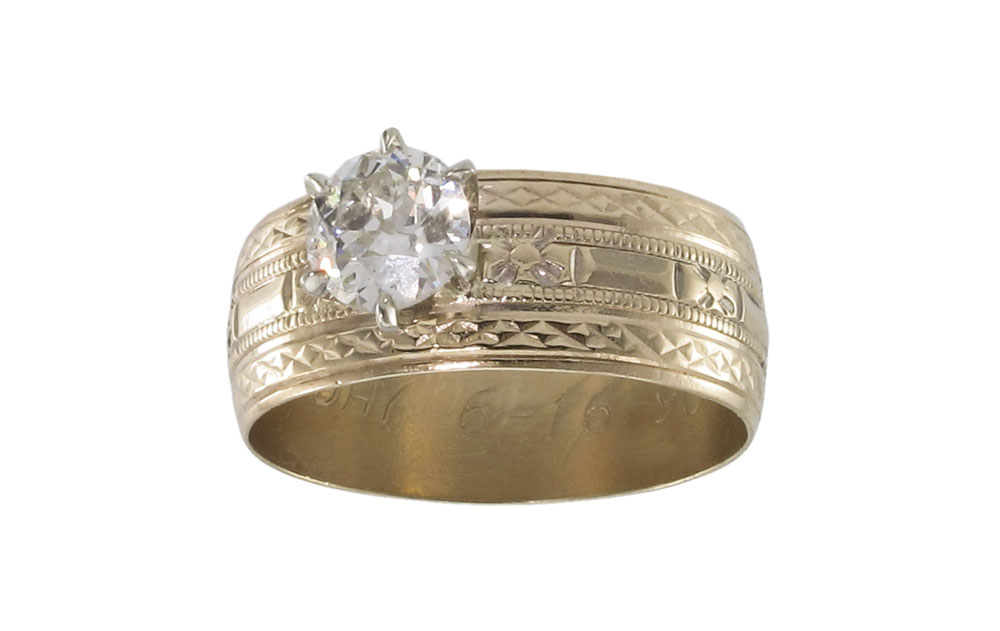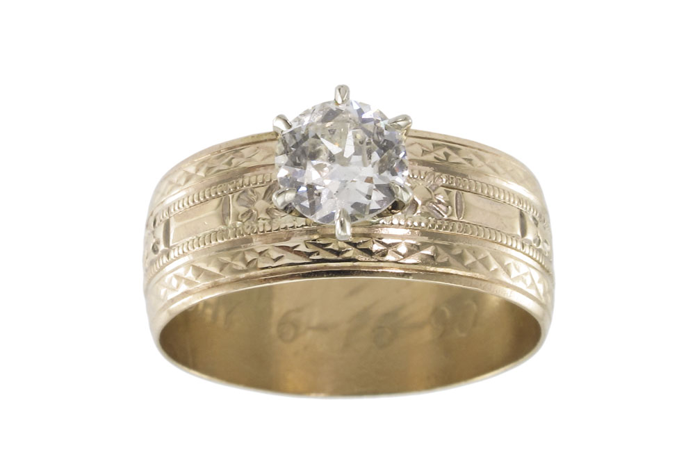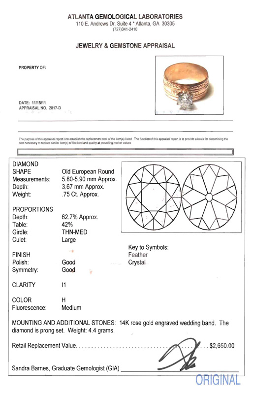 ROSE GOLD DIAMOND SOLITAIRE WEDDING BAND RING: 14k engraved gold band with a solitaire .75 Ct Old European round cut diamond, I1 in clarity and H color. Prong set. Size 7.25. Inscribed interior. Weight 4.4 grams. Sold with current Atlanta Gemological GIA graduates appraisal for $2650.