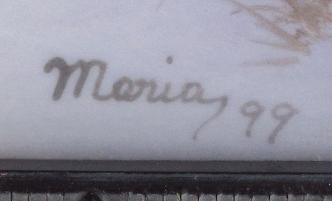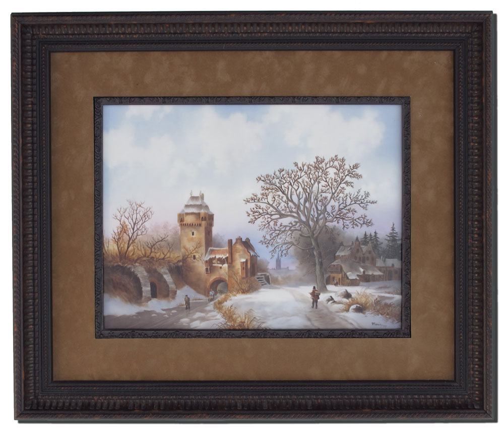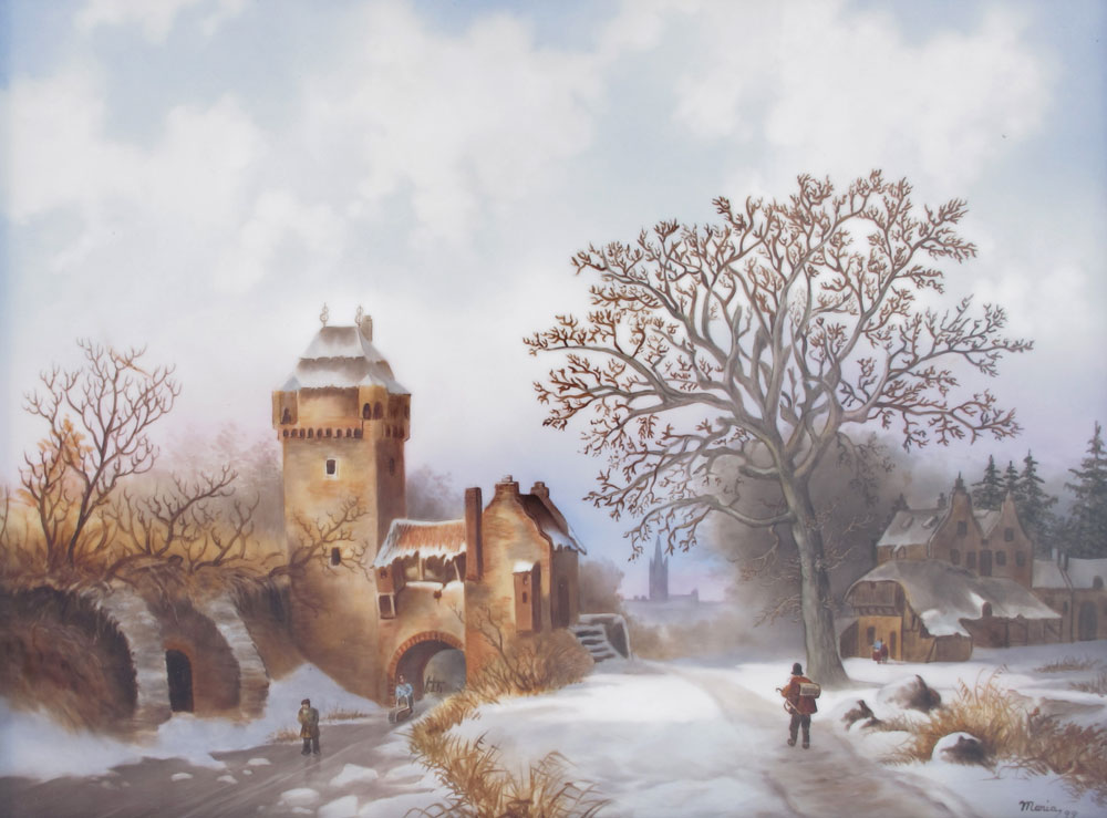 SALDARRIAGA, Maria, (American 20th C): Dutch Winter Landscape with Figures along a Frozen River, Painting on Porcelain, sight size 11 1/4'' x 15 1/4'', signed lower right, dated '99, framed, 20'' x 24''.