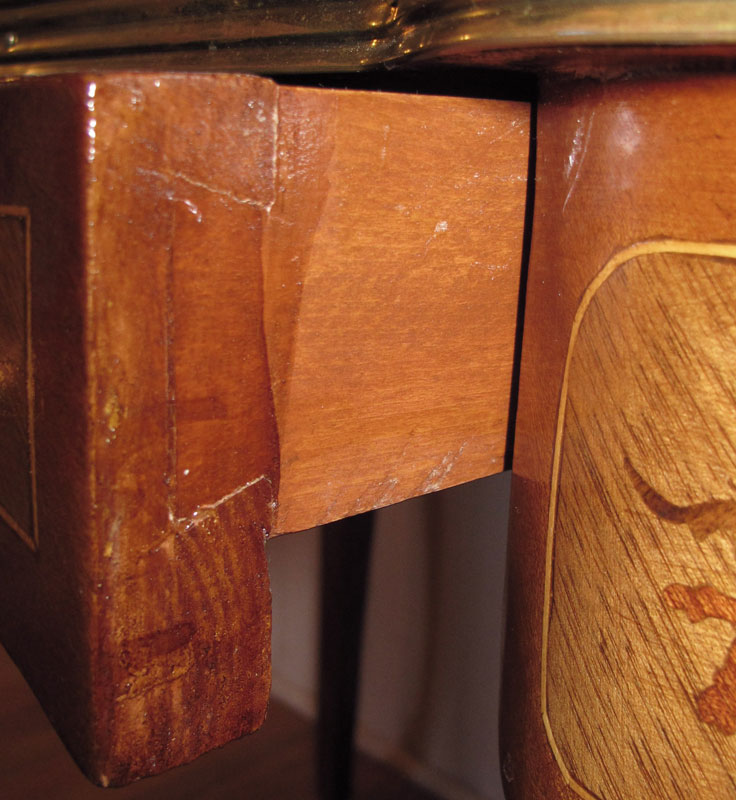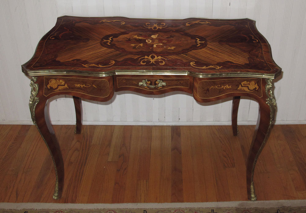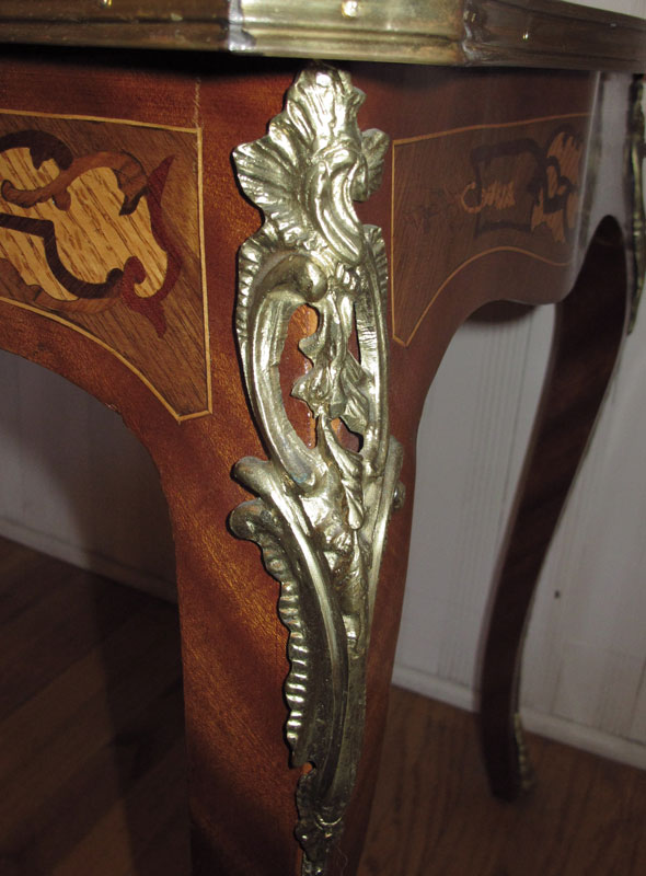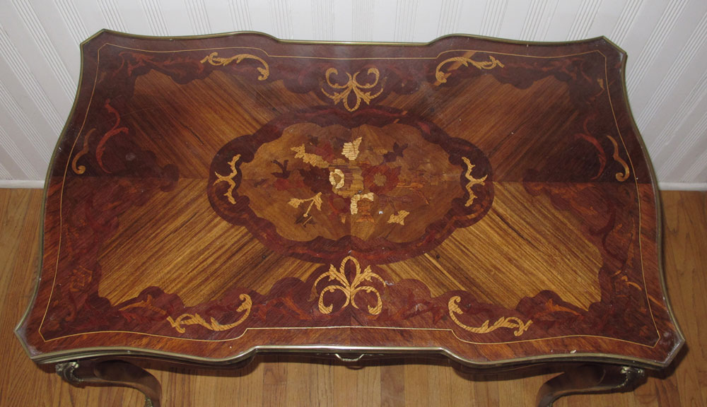 FRENCH STYLE INLAY AND ORMOLU DESK: Marquetry inlaid top with floral center medallion, floral swag and string inlay on top and sides. Single drawer. Ormolu accents on shaped legs. 28 1/2'' h. x 39 3/4'' x 24 1/2''.