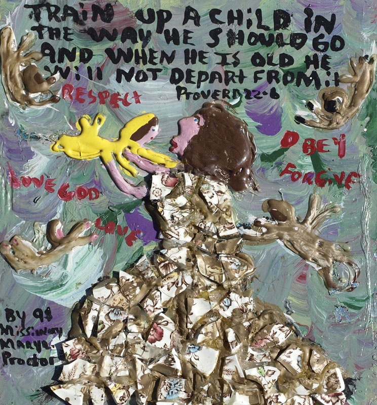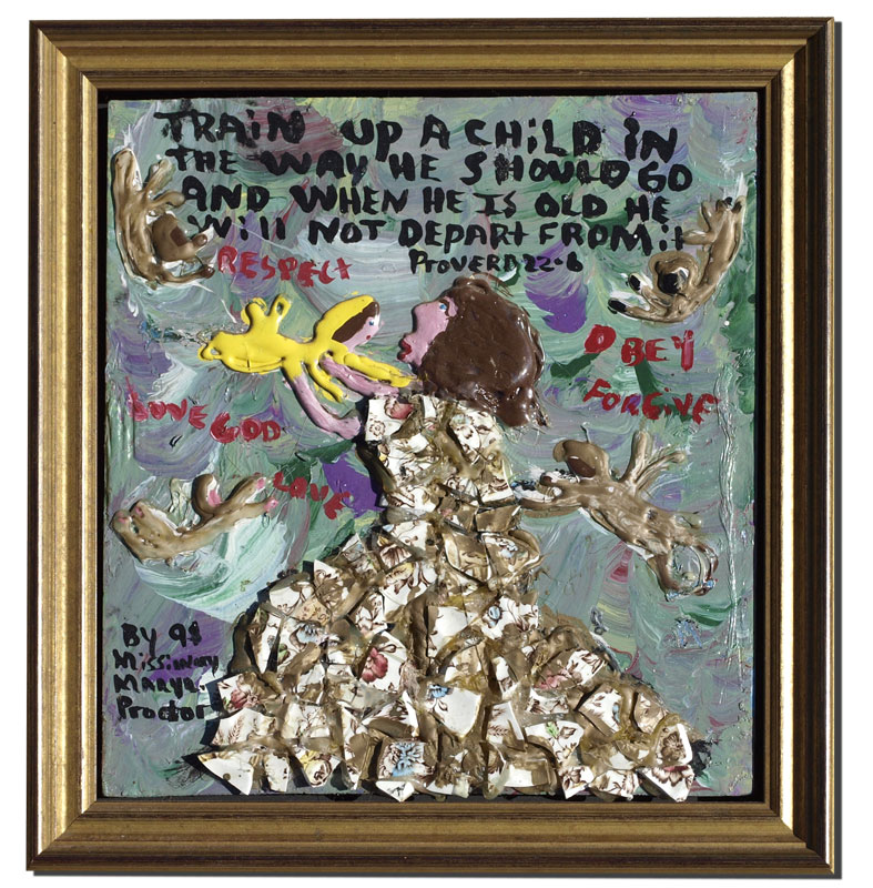 PROCTOR, Mary, (American, 20th C.): ''Train Up A Child'', Mixed Media Oil/Board With Glue and Broken Porcelain Plate, 12'' x 11'', signed and dated '91, framed, 14 1/2'' x 14''.