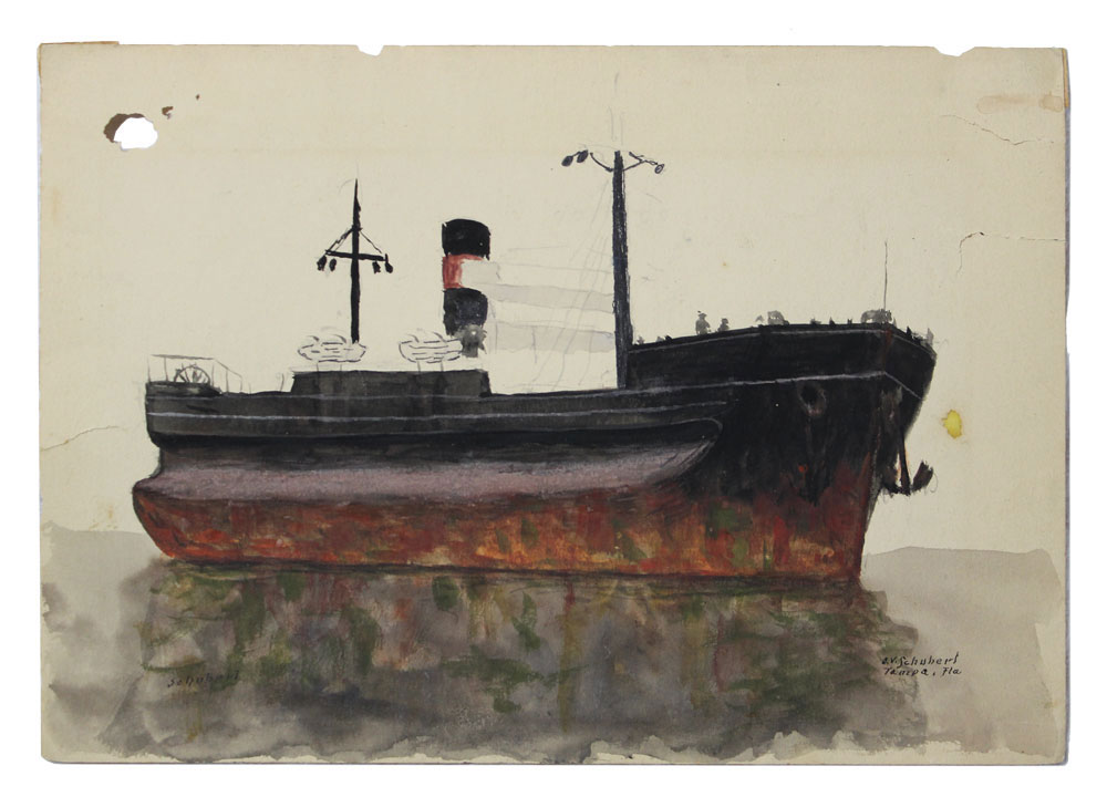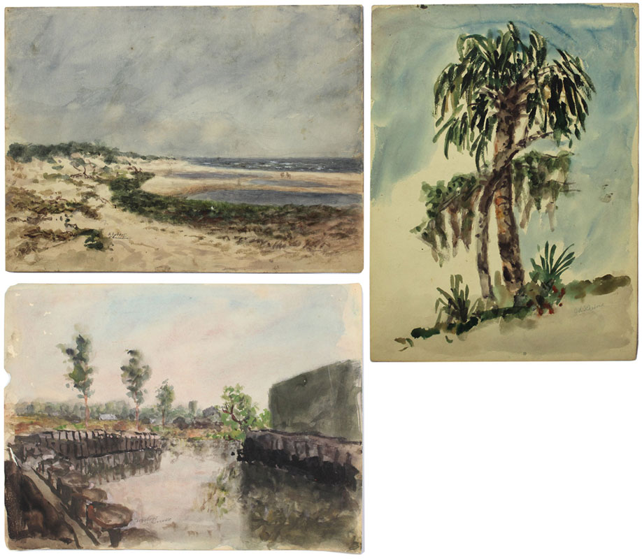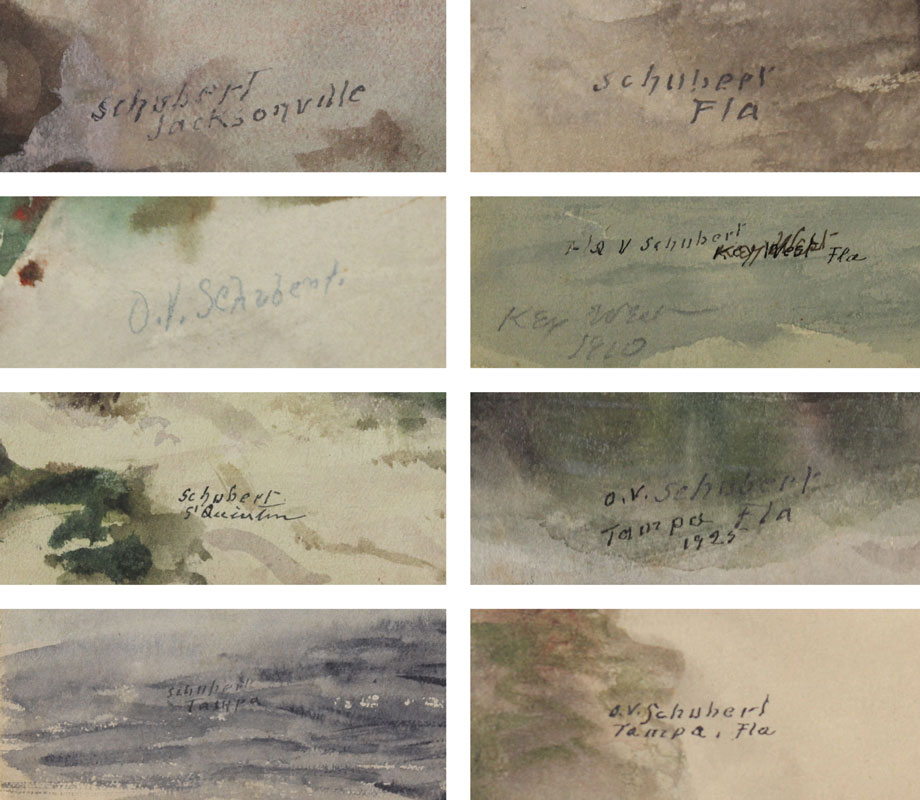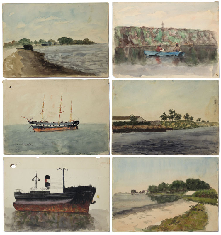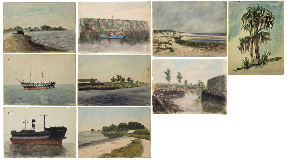 SCHUBERT, Orlando V., (American, 1844-1928): Collection of 9 early Florida watercolors to include 2 sizes, 1) Larger size 8 7/8'' x 11 7/8'', Beach Scene Quentin?, Palm Tree, Canal Scene ''Jacksonville''; 2) 6 7/8'' x 10 1/8'', Palm Beach Coastal Scene, Tampa Freight Ship, Tampa Coastal Scene, Tampa Scene with 2 Negroes in a Rowboat dated 1925, 3 Masted Ship titled ''Key West'', and dated 1910, Florida Scene; all unframed, signed.
