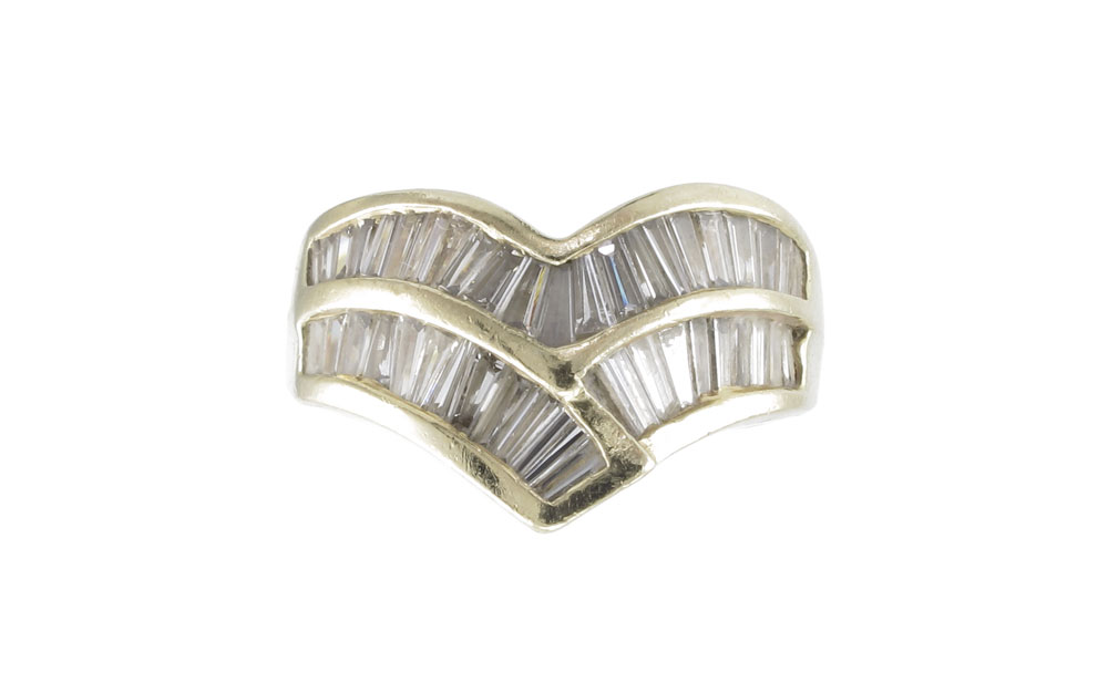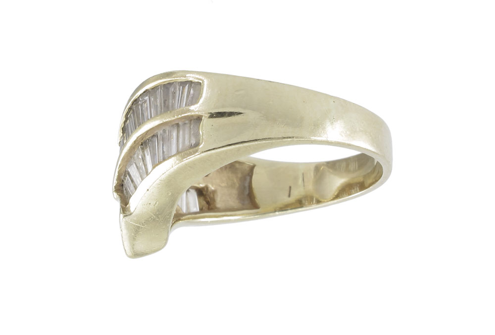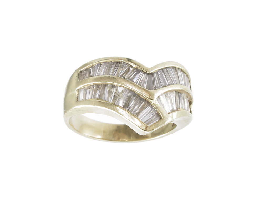 44 BAGUETTE DIAMOND RING: 14K yellow gold ring contains 44 baguette cut diamonds. Weight: 1.00 Ct. Approx. The diamonds average VS in clarity and H-I in color. The diamonds are channel set. Weight: 5.7 grams. Size: 6.5