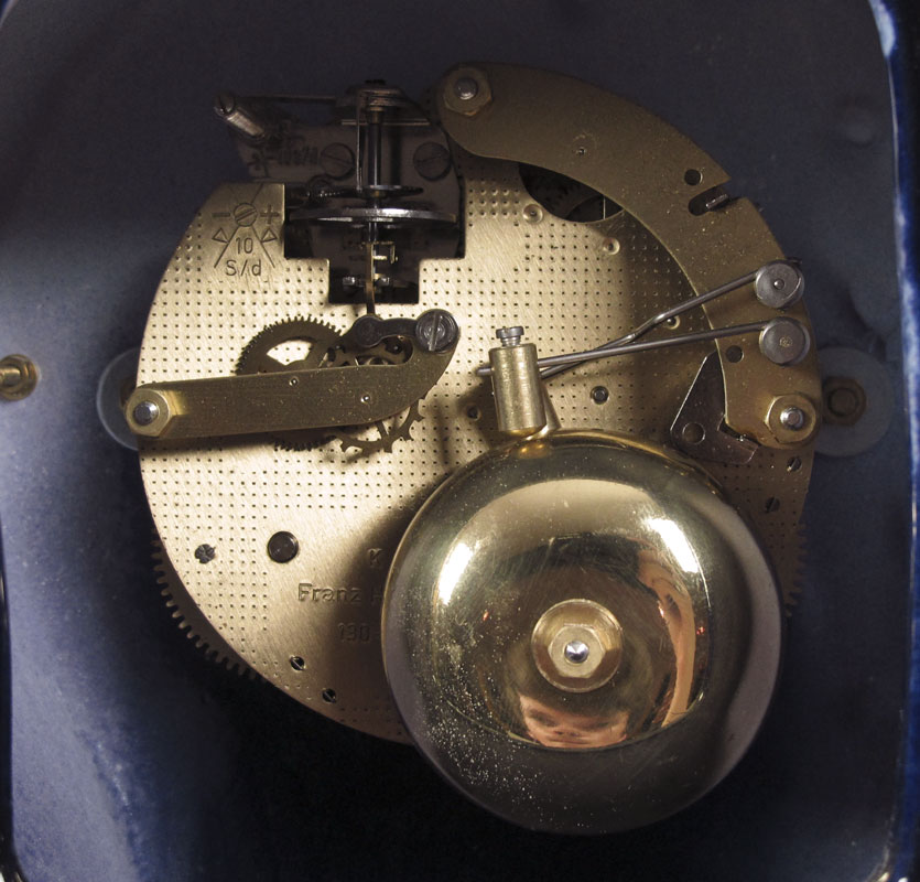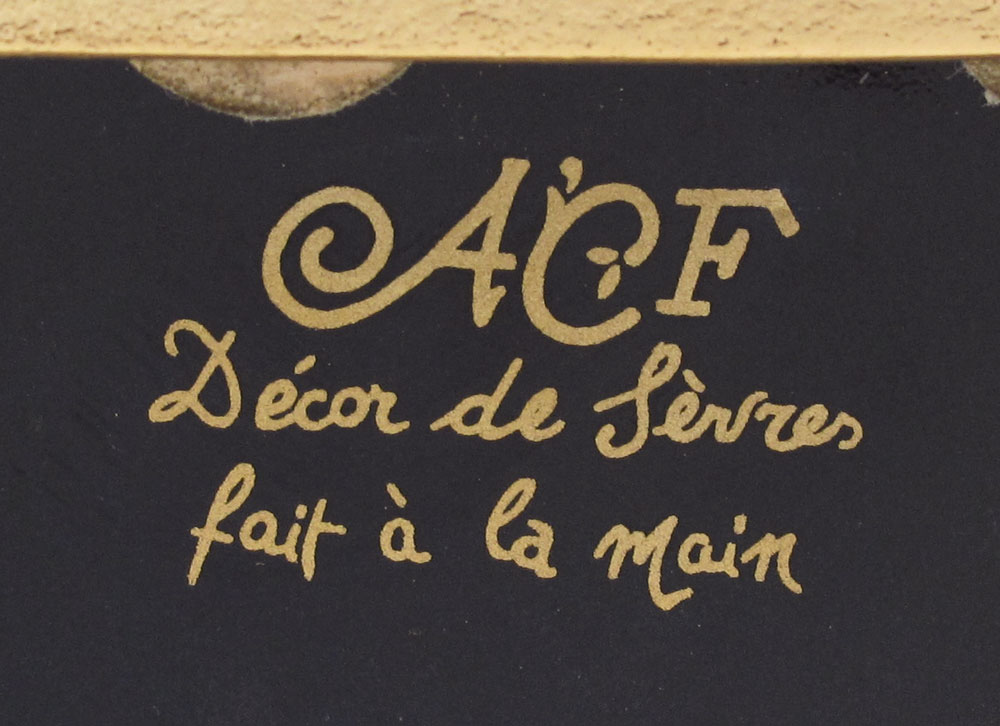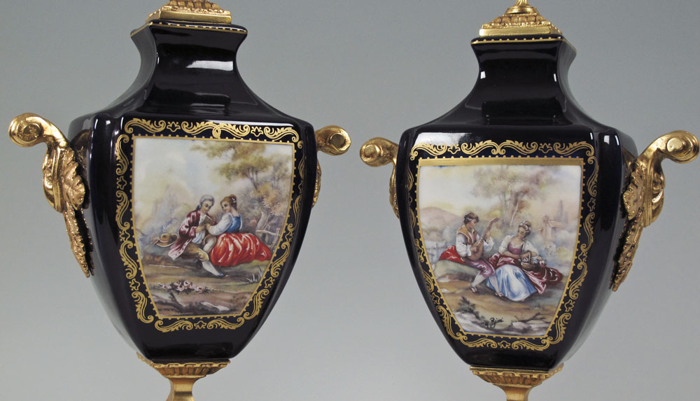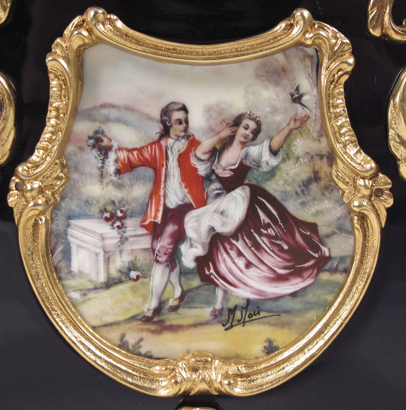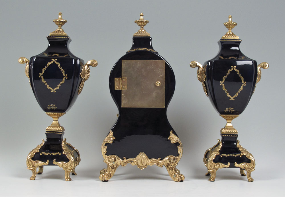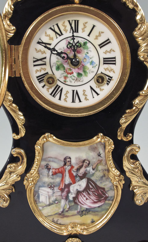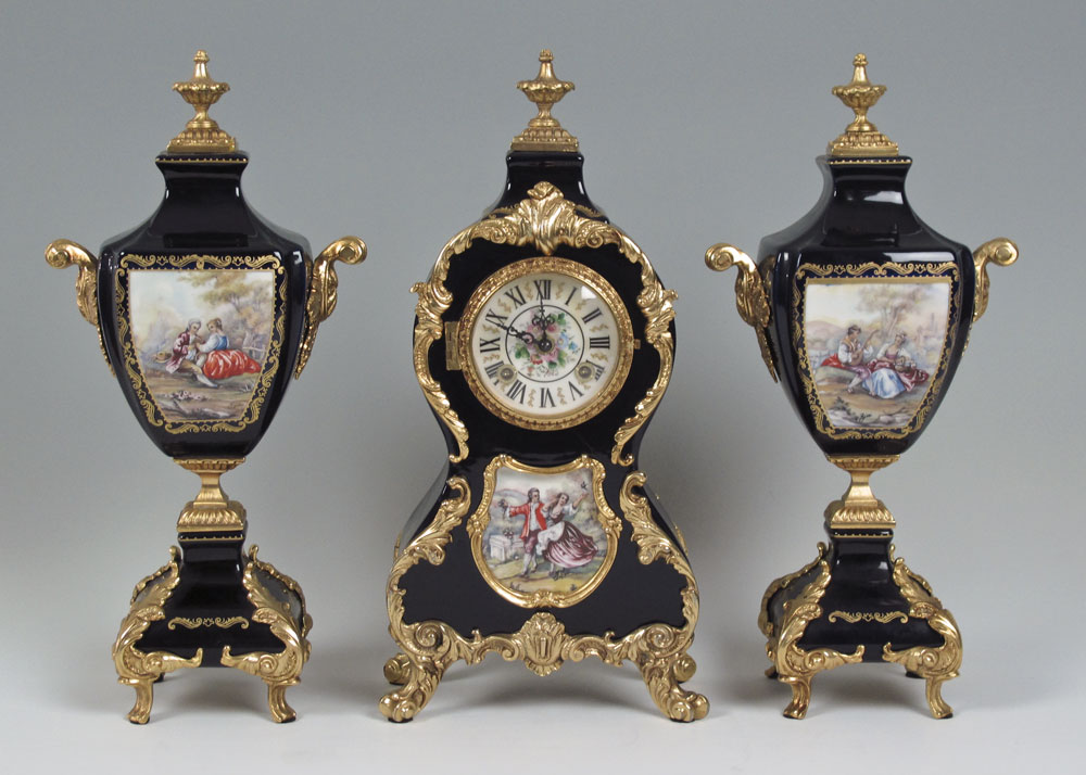 DECORATIVE PORCELAIN CLOCK GARNITURE SET: Porcelain case clock with applied transfer decoration with vignettes of lovers and floral decoration with gilt metal accents. Porcelain face with floral decoration and Roman numerals. Modern German key wind time and strike movement. 17'' h. x 8'' x 4 1/2''. Sold with matching urn shape garniture set, 17'' x 8 3/8'' x 5 1/2''.