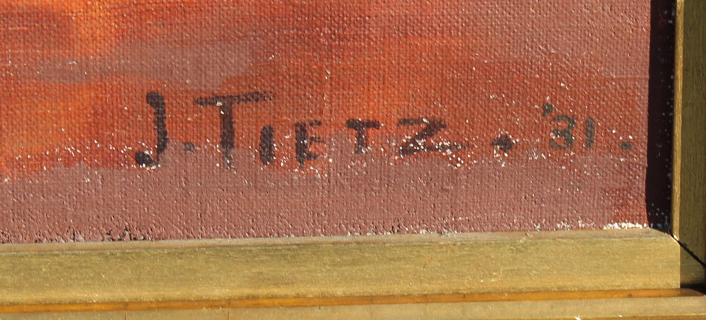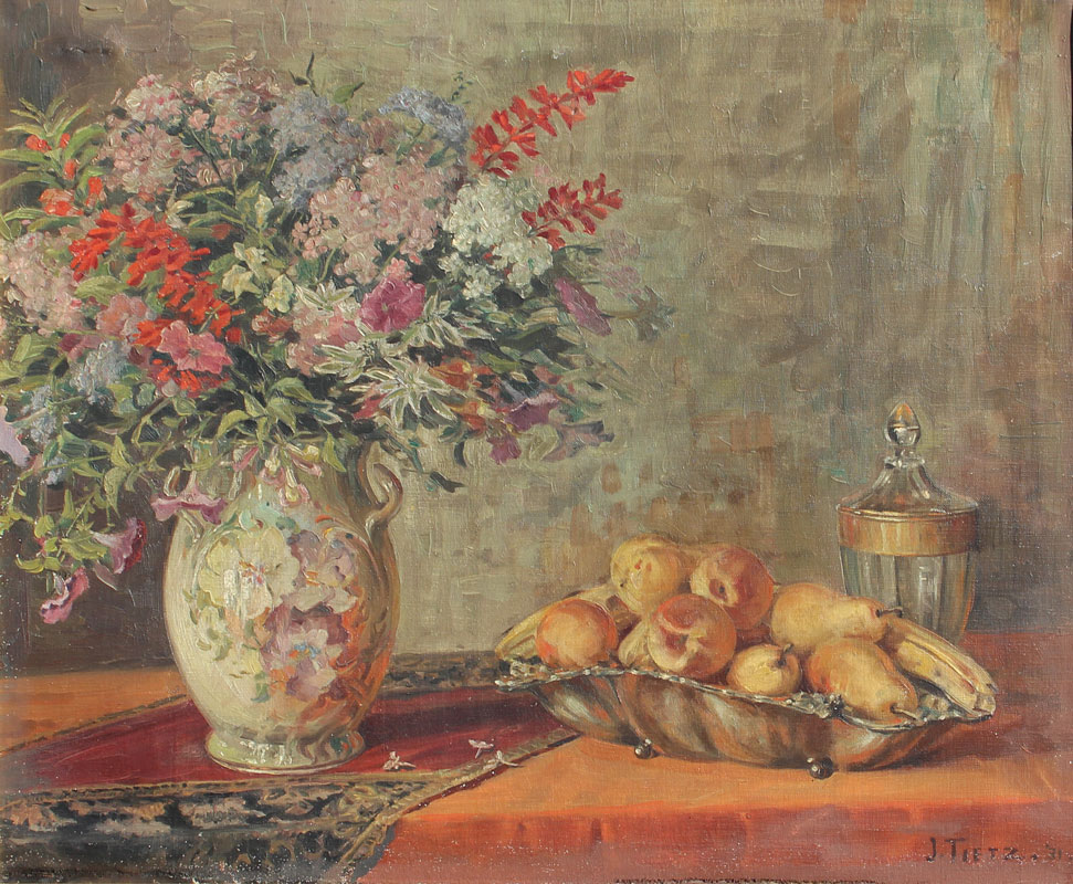 GOOD IMPRESSIONIST STILL LIFE SIGNED TIETZE: Oil/Canvas, depicts flowers in a vase, with fruit with glassware, 24'' x 30'', signed lower right J. Tietze, dated '31, gilded gesso frame with wear, repair and overpaint, 33 1/2'' x 39''.