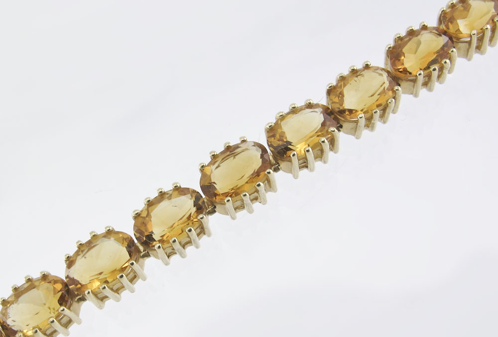 14K CITRINE BRACELET: 14K yellow gold bracelet contains 26 oval mixed cut citrines. Weight: 11.00 Ct. Approx. The citrine are ''Madeira'' in color. The citrine are prong set. Mounting weight: 6.6 grams approx. Length: 7''