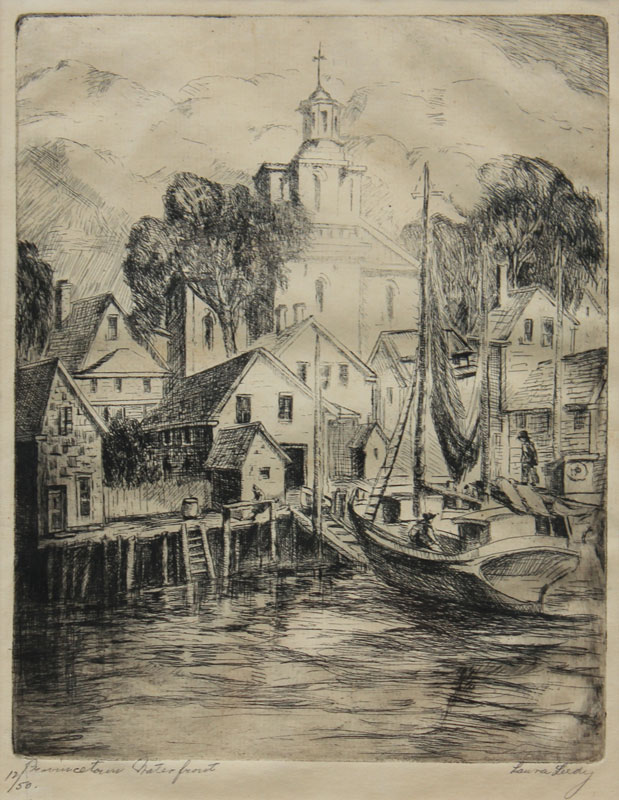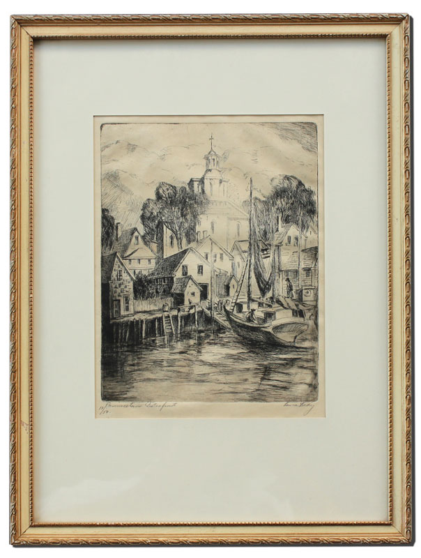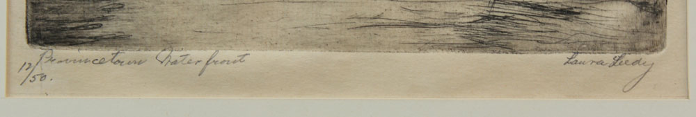 LEEDY, Laura, (American, 1881-): ''Provincetown Waterfront'', Etching, sight size 9 3/4'' x 7 1/2'', signed lower right, titled lower left and numbered 12/50, original frame, 17 1/4'' x 13 1/4''.