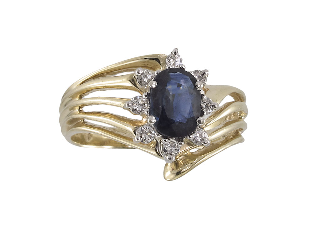 14K SAPPHIRE & DIAMOND RING: 14K yellow gold ring centers a single oval mixed cut sapphire of approx. 1.25 Ct. Rated VS in clarity (Type II), B in Hue, 6 in Tone and 3 in Saturation. Eight round brilliant cut diamonds frame the sapphire. Weight: .15 Ct. Approx. The diamonds average VS in clarity and G-H in color. The sapphire and diamonds are prong set. Weight: 4.8 grams. Size: 8.5