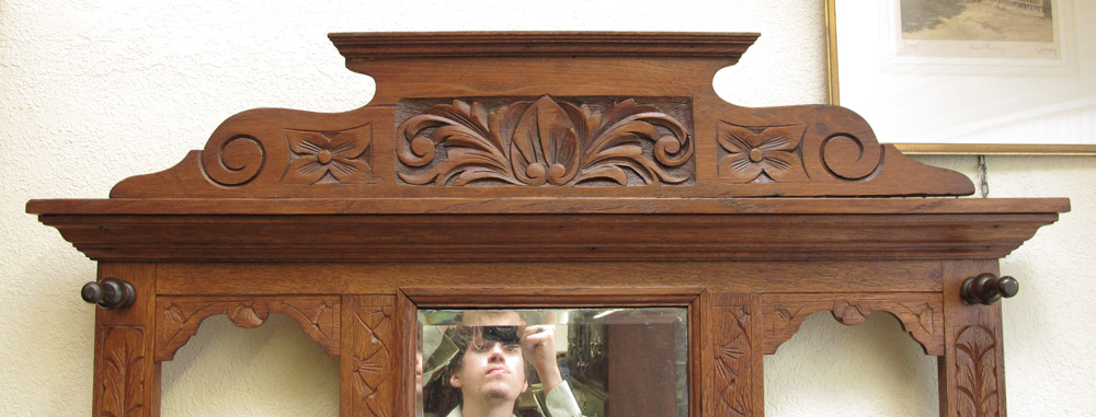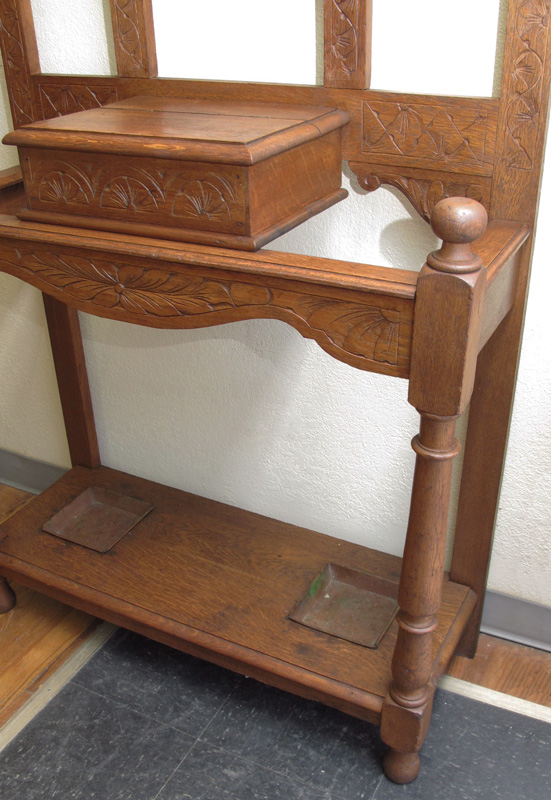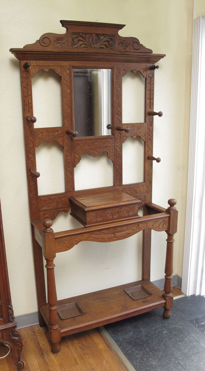 CARVED HALL TREE: Carved frame with center hinged top box, double umbrella sections with copper inserts in base. 79'' h. x 36'' x 13''.