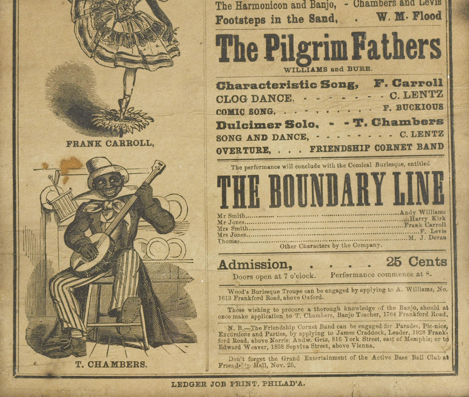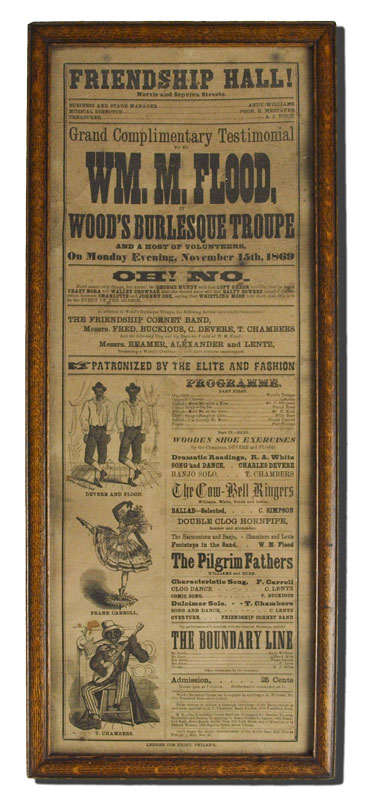 1869 BLACK AMERICAN & BURLESQUE TROOP BROADSIDE: Broadside advertisement for a Testimonial to WM. M. Flood by Wood's Burlesque Troop and also featuring The Friendship Cornet Band, Devers and Flood, Frank Carroll, T. Chambers. All at the Friendship Hall, Philadelphia. Sight size 22 3/4'' x 8 3/4'', framed 24 1/4'' x 10 1/4''.