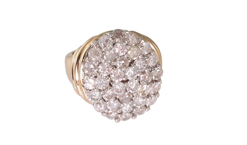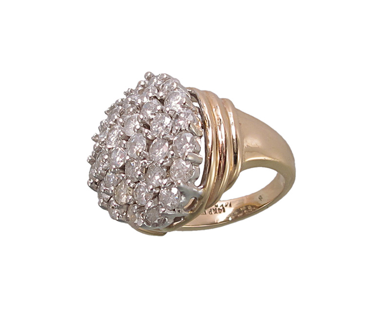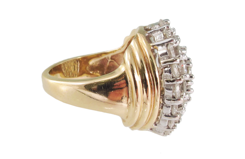 PAVE DIAMOND RING: 14K yellow gold ring contains thirty four round brilliant cut diamonds. Weight: 2.75 Ct. Approx. Rated I1 in clarity and I-J in color. The diamonds are prong set. Weight: 10.3 grams. Size: 3.5