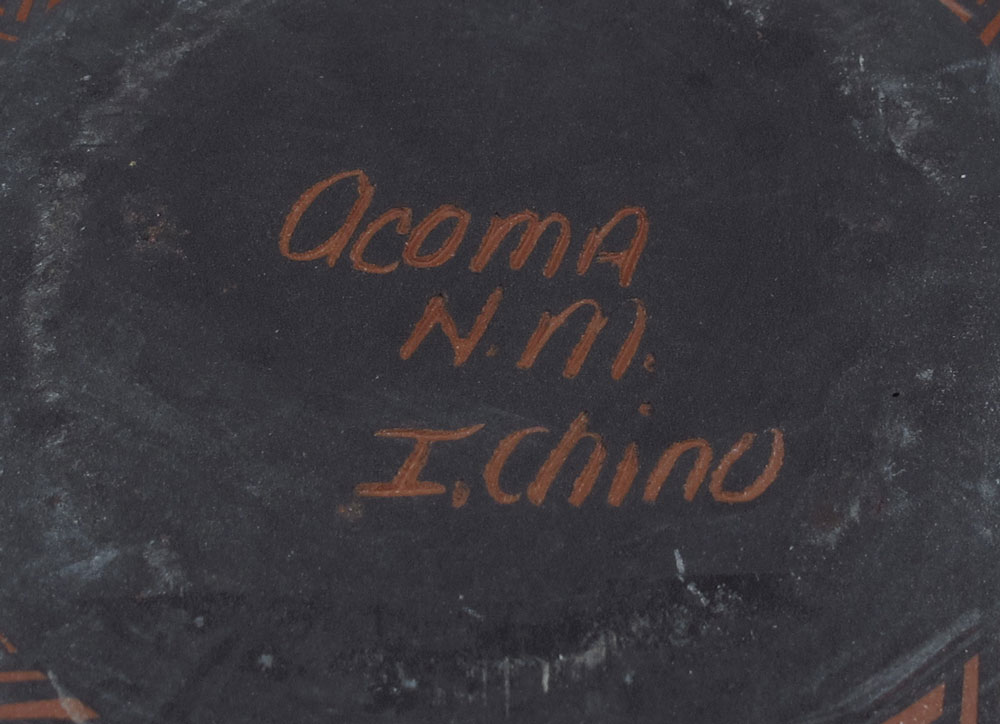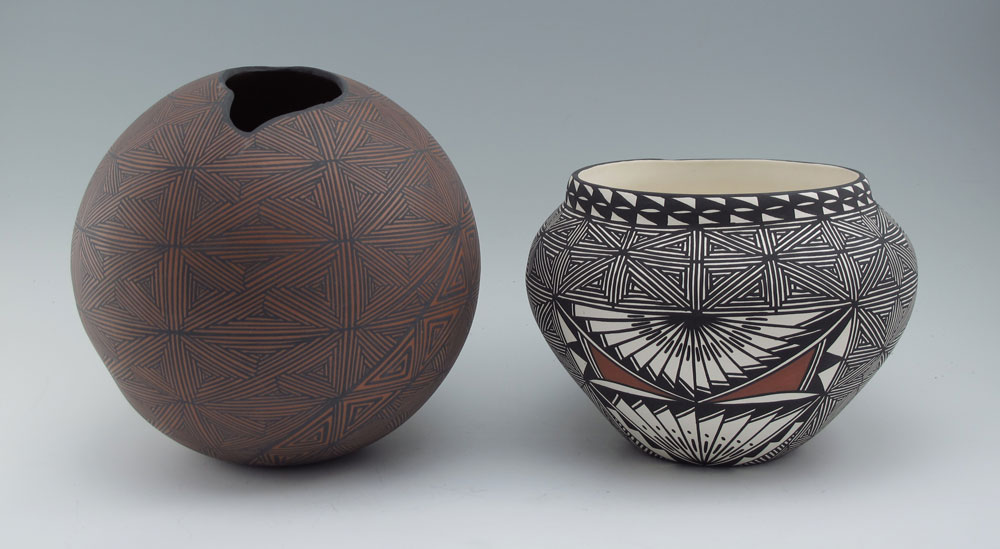 2 SOUTHWEST ACOMA POTTERY POTS: Circa latter 20th Century to include 1) I. Chino seed pot with intricate geometric pattern. Signed on base I. Chino, Acoma NM. 7 1/2'' h. x 7 1/4''. 2) Signed vessel with intricate geometric pattern with red highlights. Signed ML, Acoma NM. 5 3/8'' x 7''.