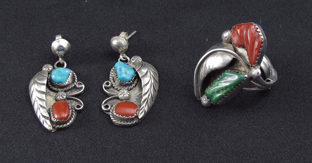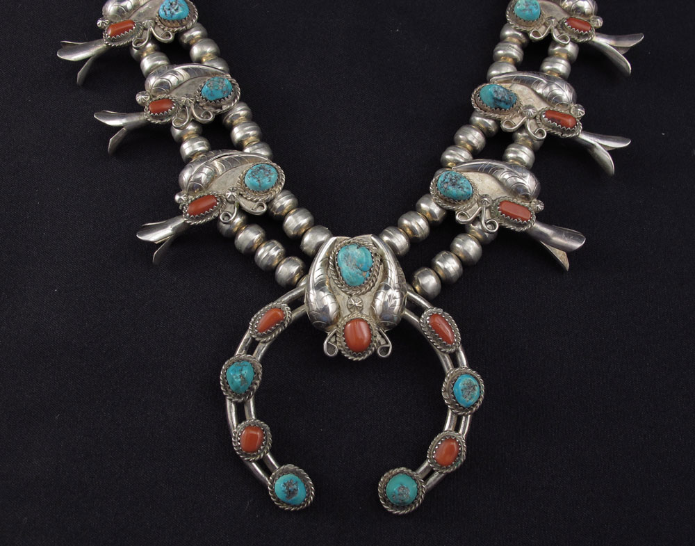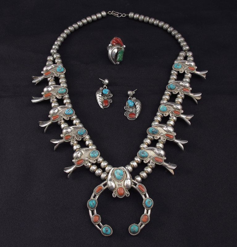NATIVE AMERICAN SILVER SQUASH BLOSSOM NECKLACE, RING AND EARRINGS: All set with coral and turquoise. Necklace with 10 blossoms on double strands of beads, 2 1/2'' naja with illegible signature to back, approx. 22''l. Ring 1 1/4'' x 3/4'', size 8.75, unmarked. Drop earrings 1 3/8'' x 5/8'', post findings, unmarked. Silver content unknown, weight 4.475 Troy oz. inclusive.