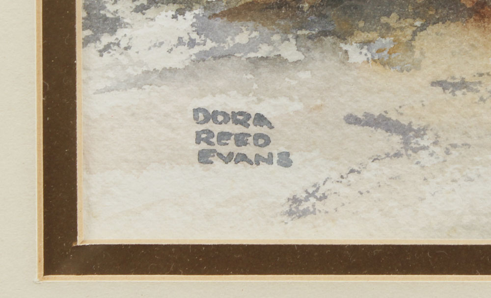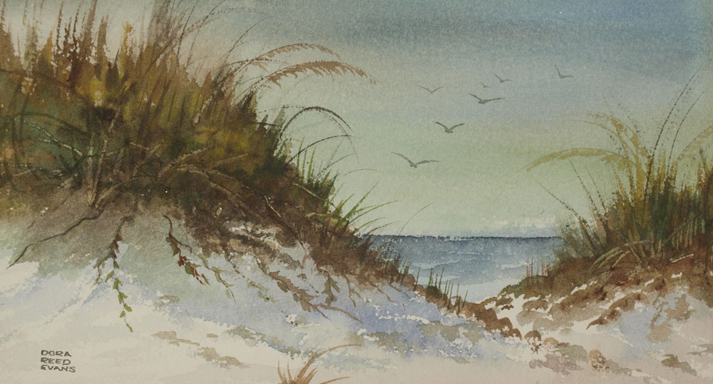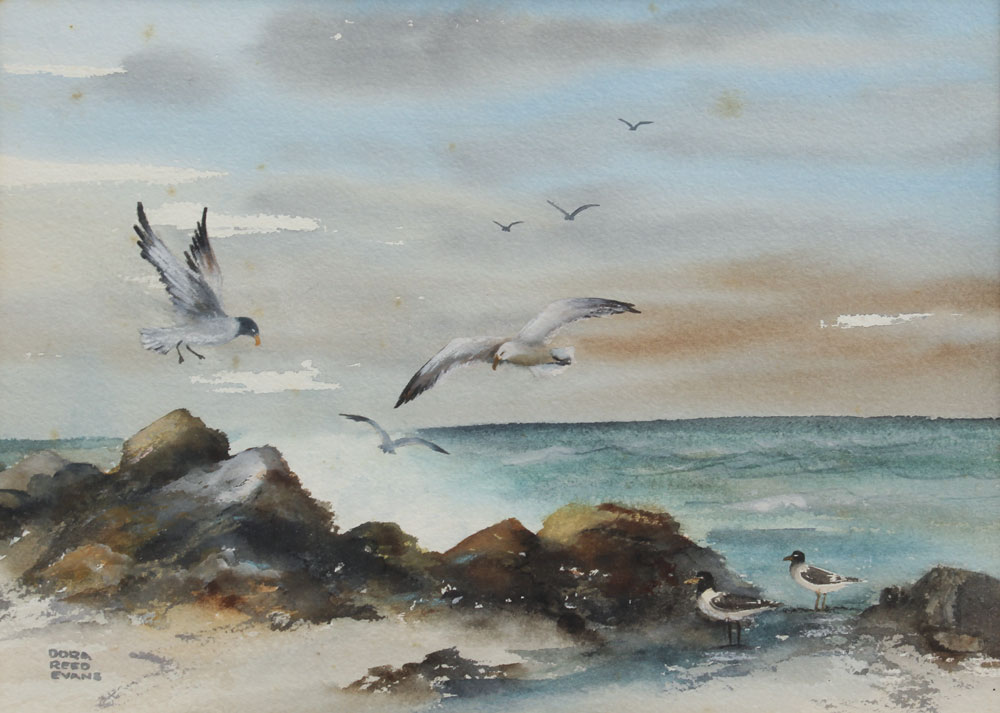 EVANS, Dora Reed, (American, 20th C.): 2 PC Painting lot to include; 1) Beach Scene With Sand Dunes and Gulls, Watercolor, sight size 6 1/2'' x 12'', signed lower left, framed, 12 1/2'' x 17 1/2''; 2) ''Gulls on the Coast'', sight size 12'' x 14'', signed lower left, framed 18'' x 20''.