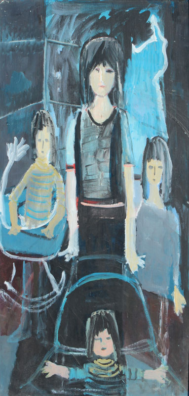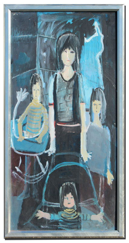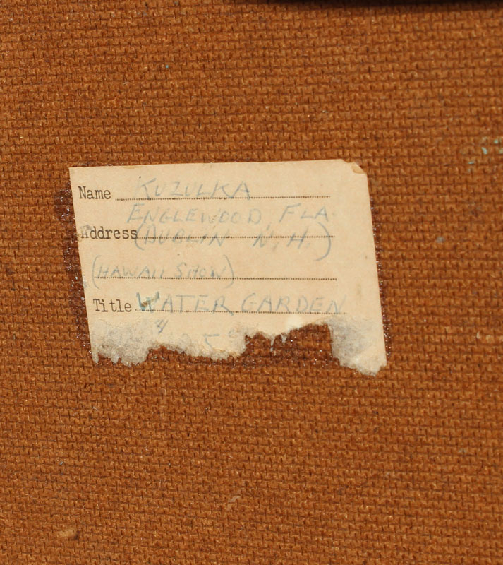 KUZULKA, Kierstead, (American, 1905-1985): ''Water Garden'', Oil/Masonite, depicts mother and children in landscape, 48'' x 24'', no visible signature, label verso, newer silver gilt frame with wear, 51'' x 26 1/2''. Studied with Wayman Adams, Robert Henri, John Sloan, and Robert Brackman , to name a few. Member of the Art Student's League.