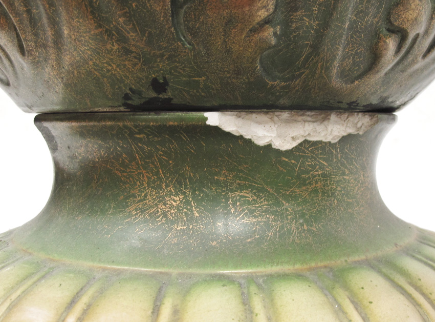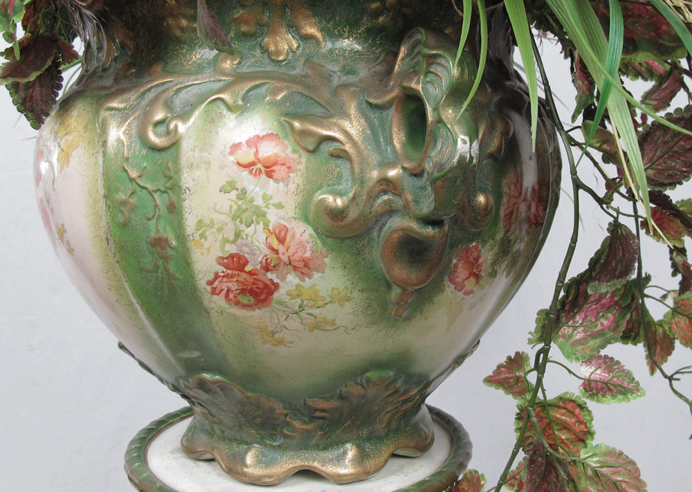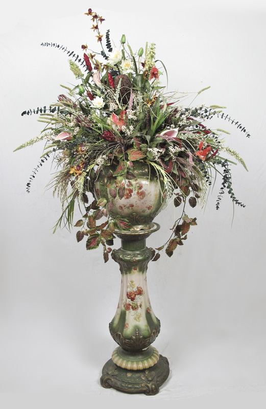 LARGE JARDINIERE AND STAND: Double handle jardiniere with transfer floral design. Sold with matching stand and large arrangement of artificial flowers. Jardinier 14 1/2'' h. x 24'', stand 36 1/4'' h. x 18'' base dia.