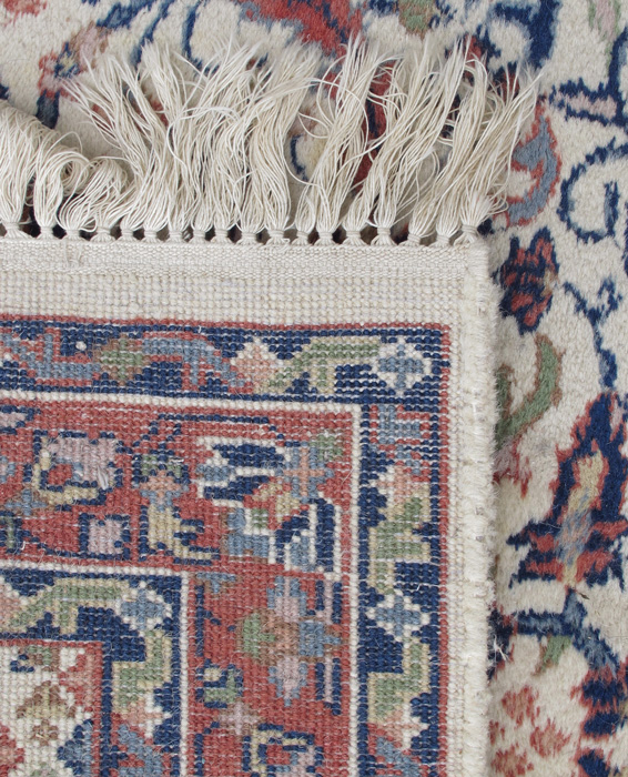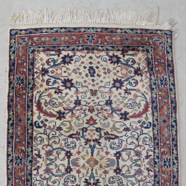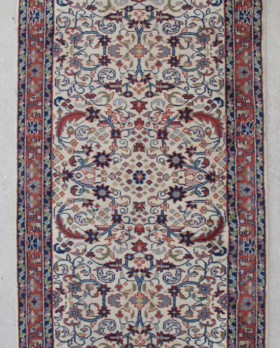 INDO-PERSIAN HAND KNOTTED WOOL RUG, 2'8 1/2'' x 16'2'': This long runner has colors of rust, deep and medium blue and pale green on a white ground. The runner is very attractive and will go well in almost any setting. Another plus is that this runner is ''true''. It doesn't bend or curve. Condition is good.