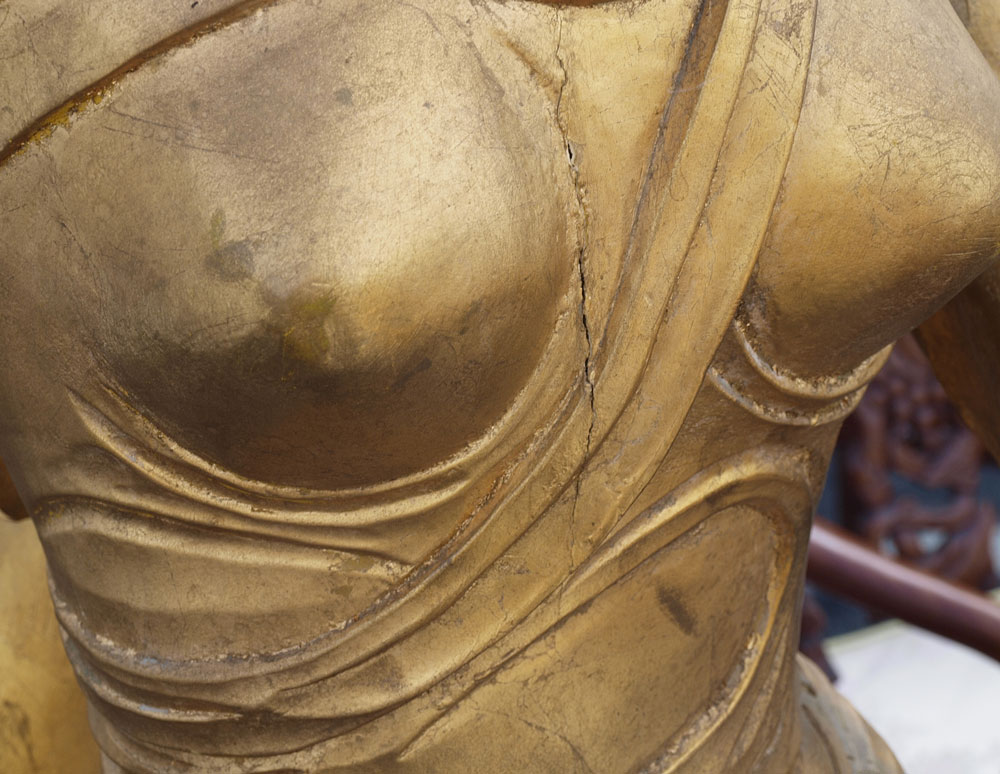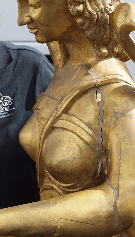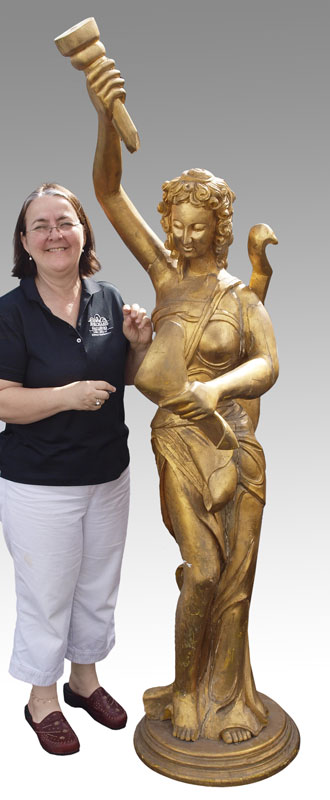 LIFE SIZE CARVED GILT WOOD STATUE OF GREEK MUSE: Figural maiden holding torch and scroll with lyre on back. Measures approx. 79'' h. x 21'' x 31''
