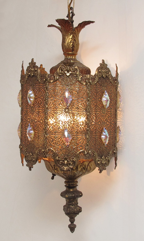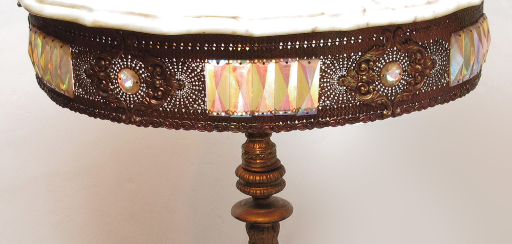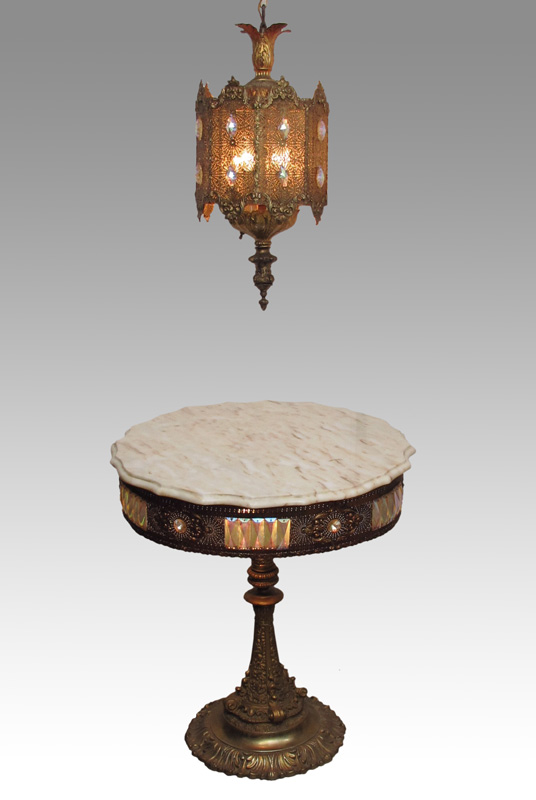 MARBLE TOP GILT TABLE AND HANGING LAMP: Shaped marble top with thin pierced metal skirt with inset iridescent prisms. Top illuminates from underneath. Cast metal base. 27 1/2'' x 25 1/2''. Sold with matching hanging lamp, 22 1/2'' x 10'' dia.
