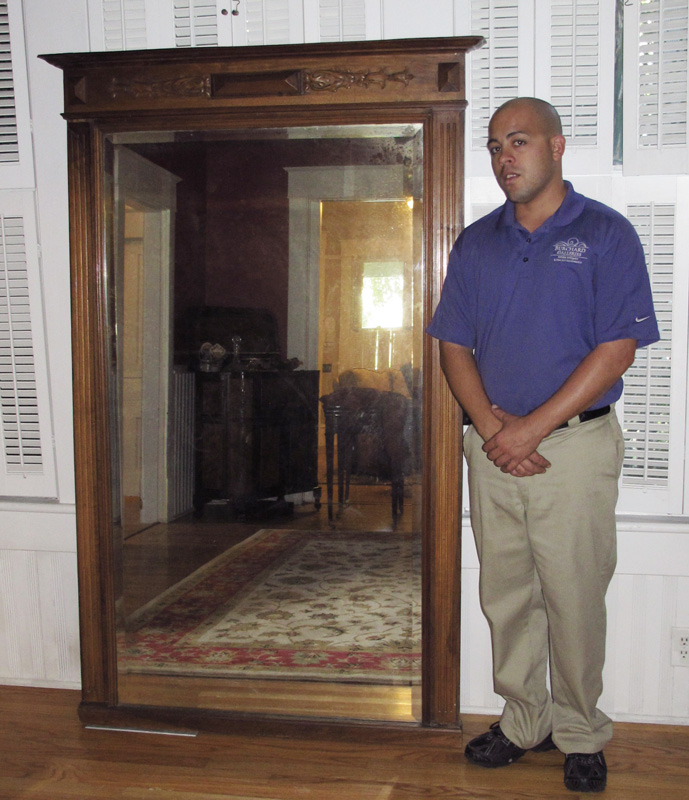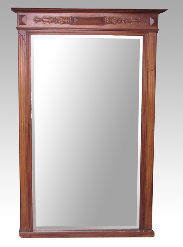 LARGE VICTORIAN HALL MIRROR: Frame with carved applied decoration on crest, fluted sides. 74 3/4'' h. x 47 1/2'' x 4 1/4''. Beveled glass mirror, 64 1/2'' h. x 35''.