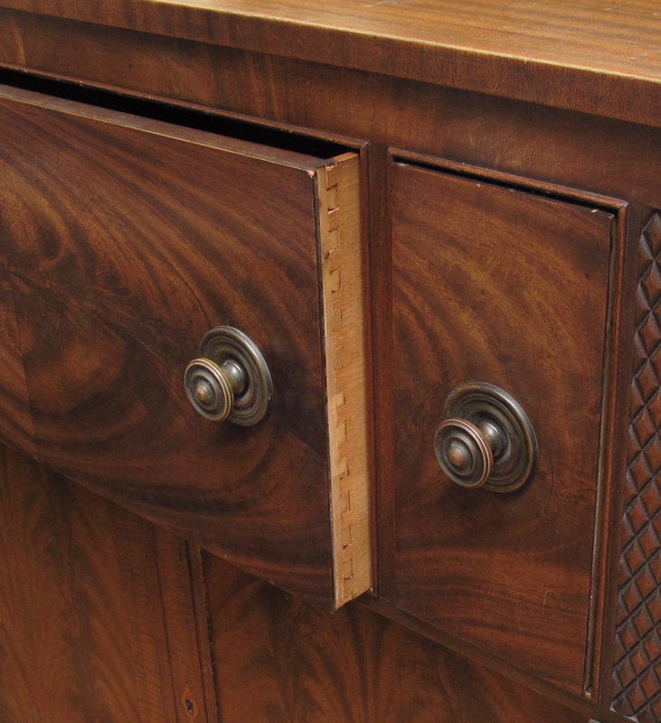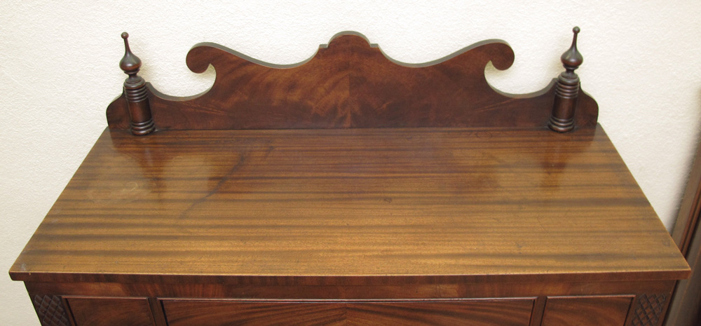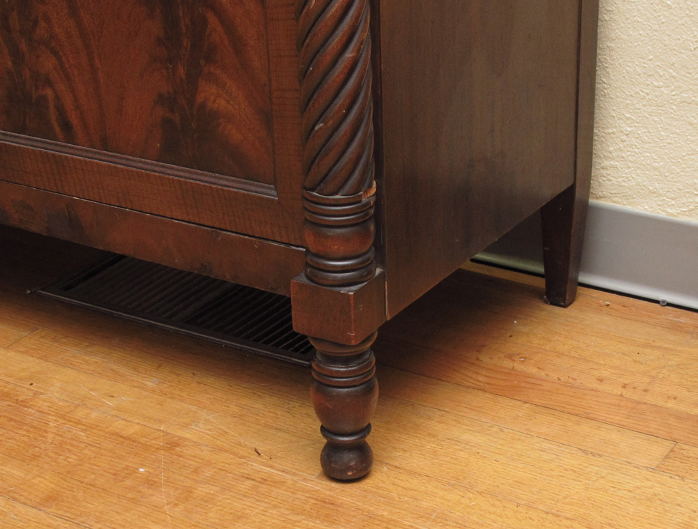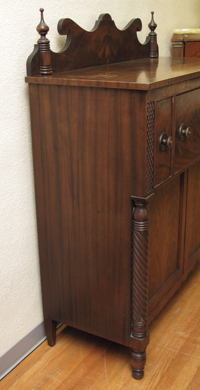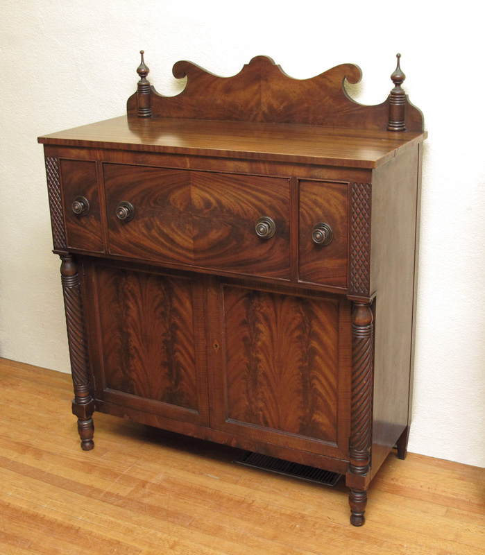 MID 18O0'S AMERICAN EMPIRE MAHOGANY SIDEBOARD: Matchbook veneer drawer fronts. Center drawer flanked by two narrow drawers (bottle size). The drawers are extra deep at 11''. Lower cabinet doors. Cross hatched, spiral stiles, turned feet. Shaped backsplash with finials. Measures approx. 57''h. x 46'' x 20''.