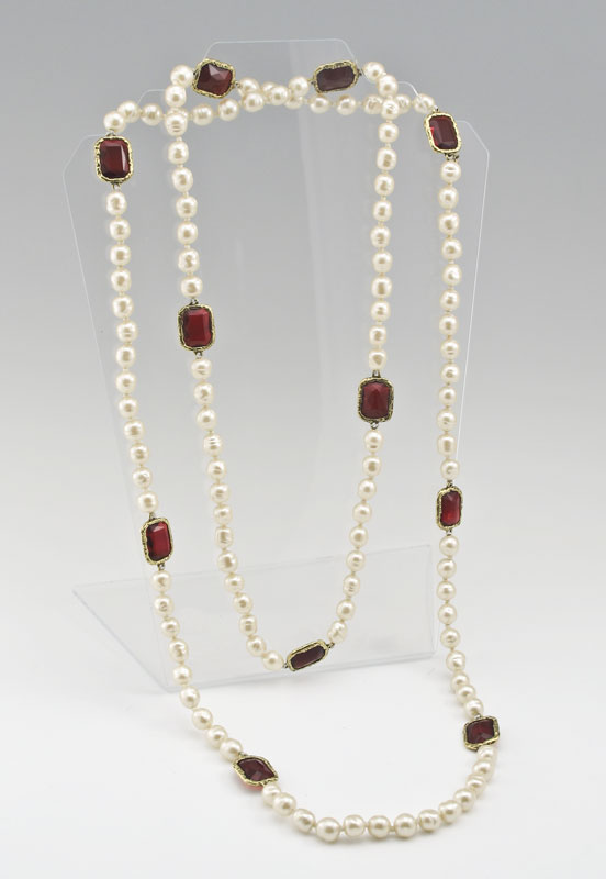 CHANEL FAUX PEARL AND RED GLASS NECKLACE: A decadent 64'' strand necklace of faux baroque pearls and red glass. Signed Chanel 1981 double C logo charm tag.