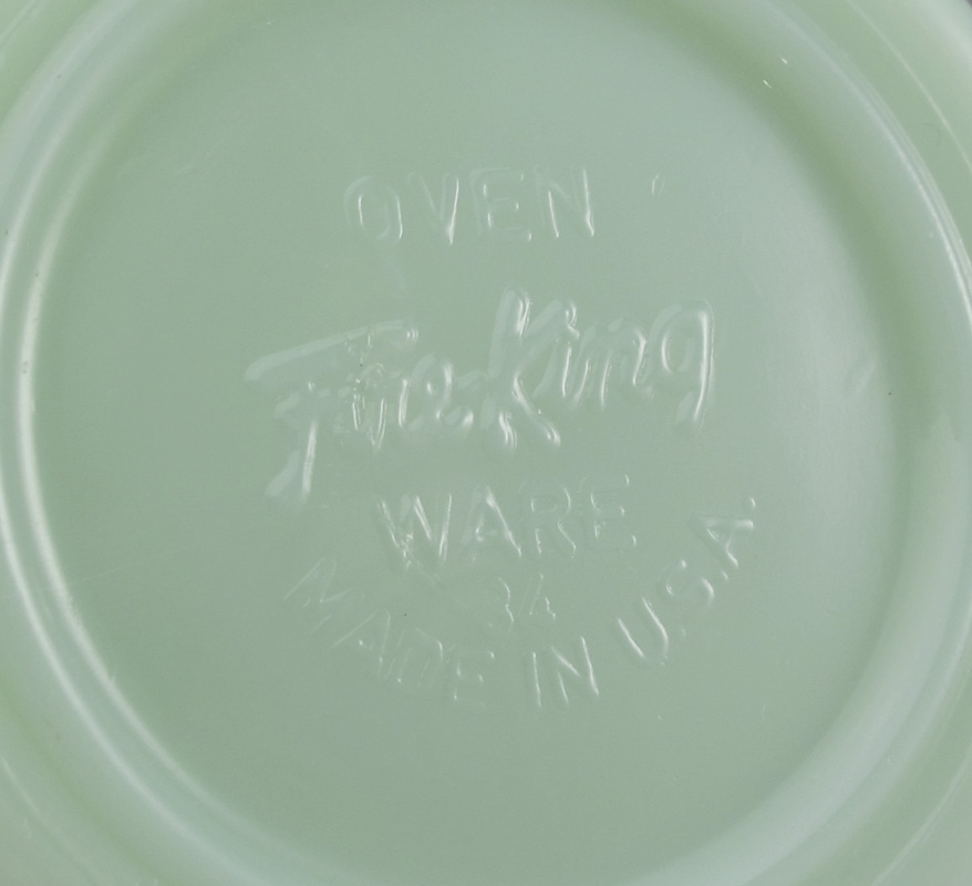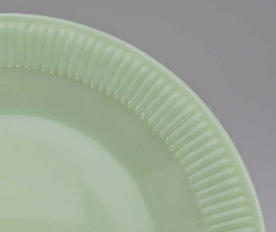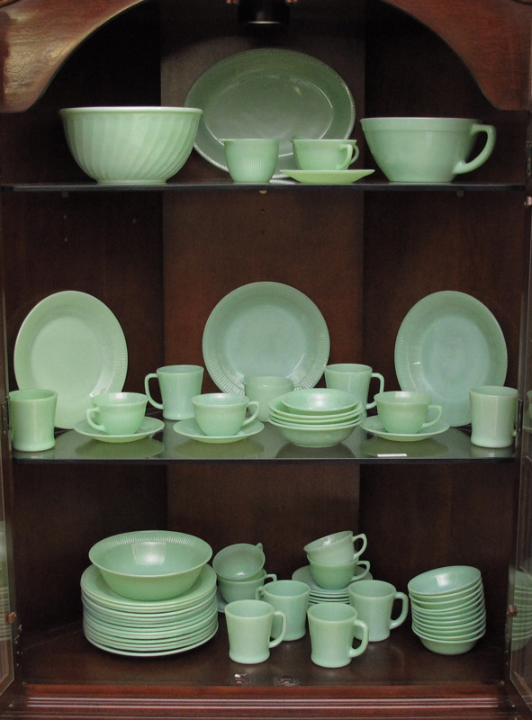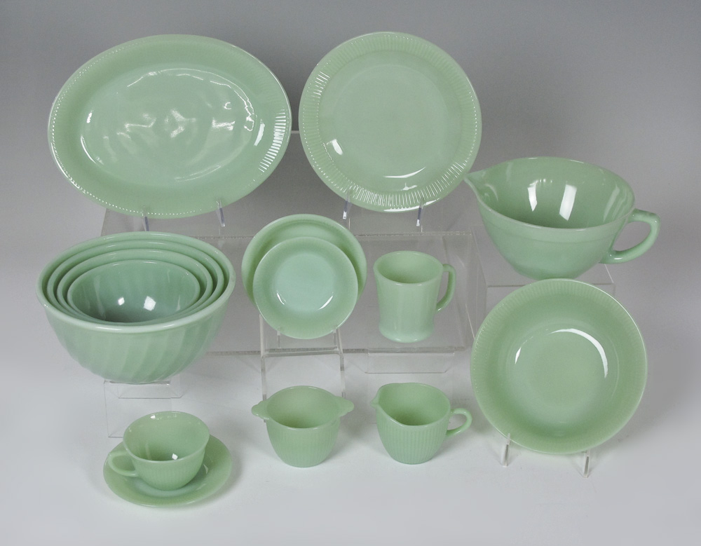 VINTAGE FIRE KING JANE RAY GREEN JADEITE GLASSWARE: Approx. 71 pieces includes a batter bowl, nest of 4 Swirl mixing bowls and 8 coffee mugs. In the Jane Ray pattern are 16 plates (9''), 4 bowls (6''), 12 dessert bowls, 8 cups, 13 saucers, 2 creamers, sugars, an 8 1/4'' serving bowl, and a 12'' platter.
