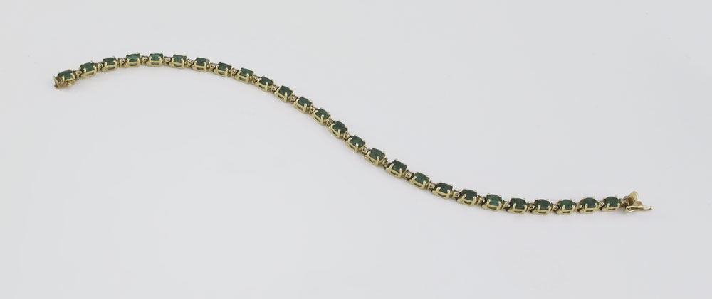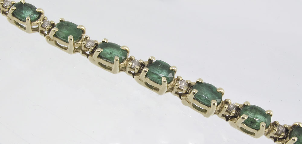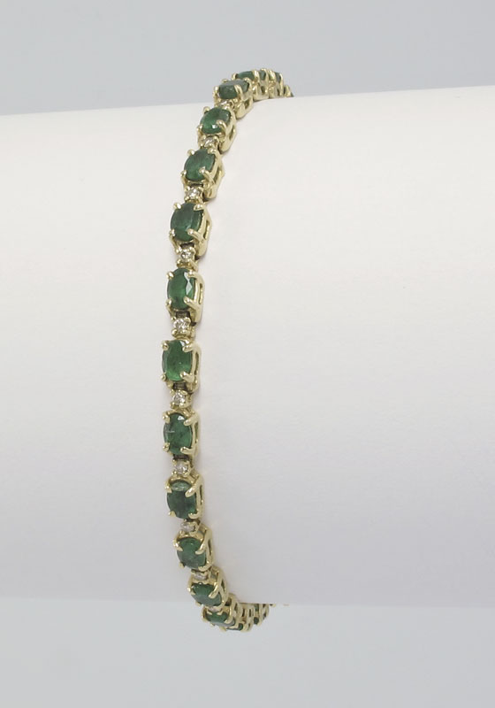 14K EMERALD & DIAMOND BRACELET: 14K yellow gold bracelet contains 26 oval faceted emeralds. Weight: 3.75 Ct. 26 round full cut diamonds. Weight: .25 Ct. approx. Rated SI in clarity and J-K in color. The emeralds and diamonds are prong set. Weight: 7.8 grams. Locking closure with figure eight safety clasp. Length: 7.25''