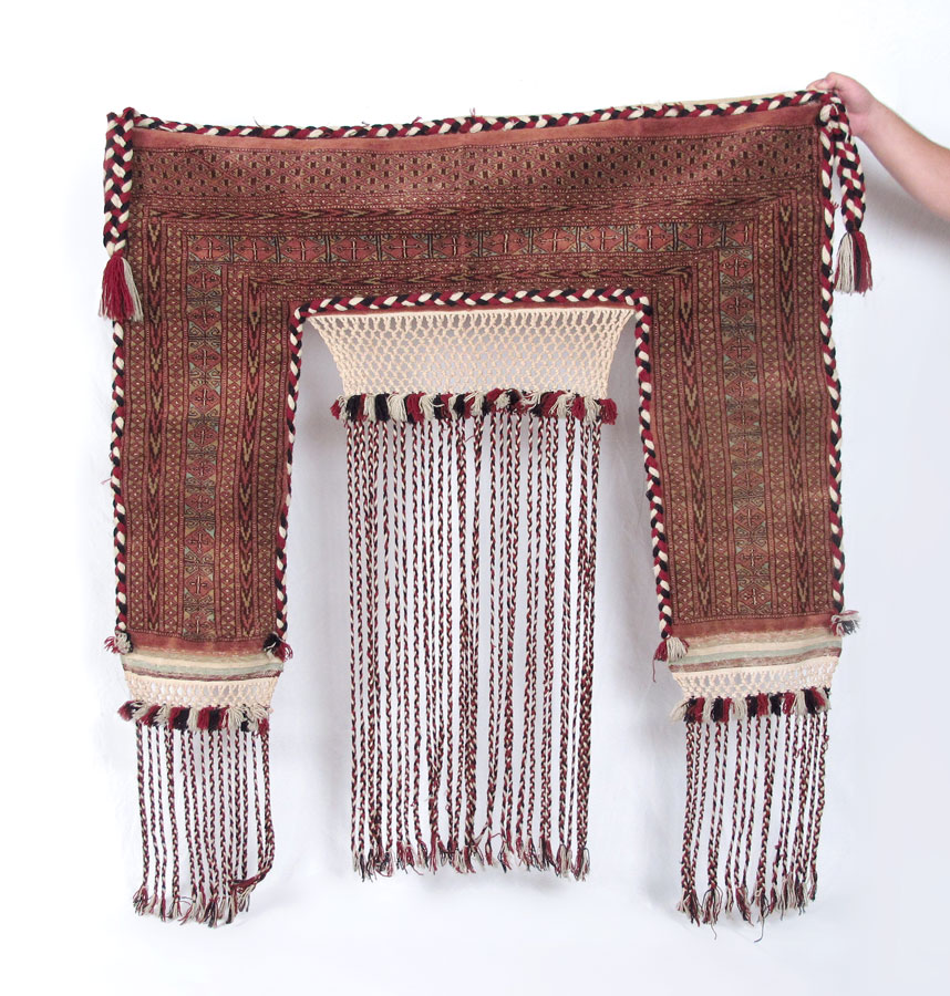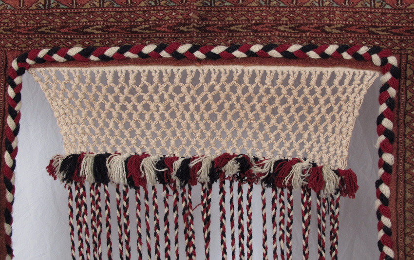HANDMADE TURKISH CARPET TENT/ DOOR/ ENTRYWAY DECORATION: Appears to be constructed from an old carpet with braided trim, macrame below center and side panels with braided fringe hanging. 60 1/2'' x 49 1/2''.