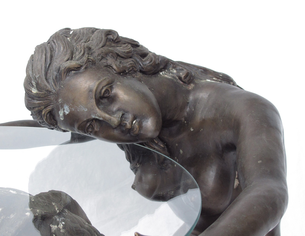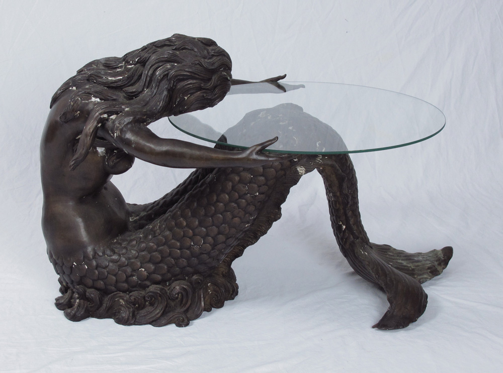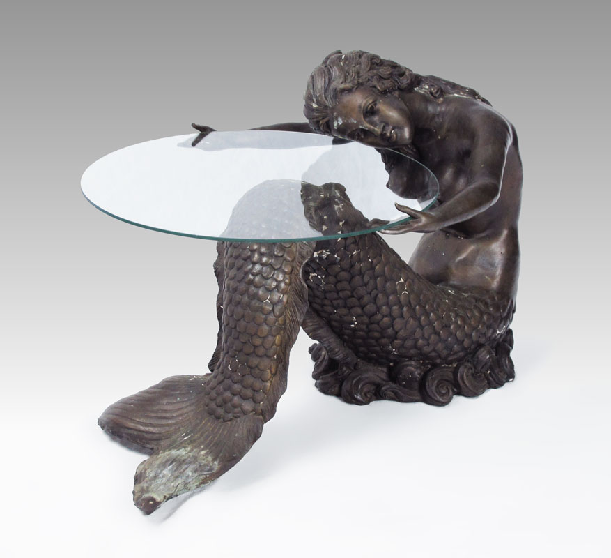 BRONZE FIGURAL MERMAID: Removable glass tray in her hands. 20 1/2'' h. x 32'' x 20 1/2''.