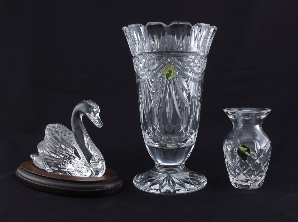 WATERFORD SOCIETY CRYSTAL ITEMS: To include, 1995 PENROSE VASE # W207.858.6100, 8 1/2''h.; 1996 SWAN on wood base # W008.111.0010, 4 1/2'' x 5 1/2''; and 1995 POSY VASE # W202.487.5300, 4 1/4''. All with boxes, sold as a lot.