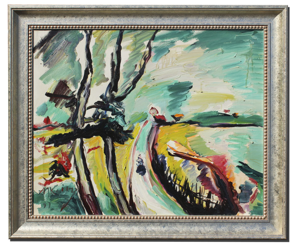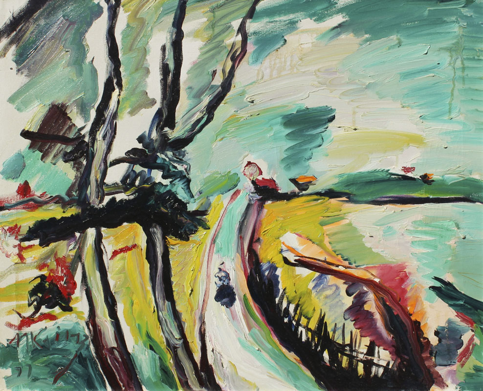 KAINZ, Martin, (German, 1899-1982): Landscape Along the Shore, Acrylic/Canvas, 24'' x 30'', signed lower left and dated '77, encased in contemporary silver gilt frame, 30 1/2'' x 36''.
